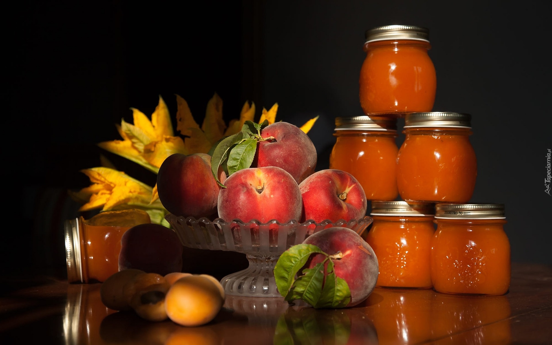 Edytor tapety: Słoiki z dżemem obok patery z brzoskwiniami
