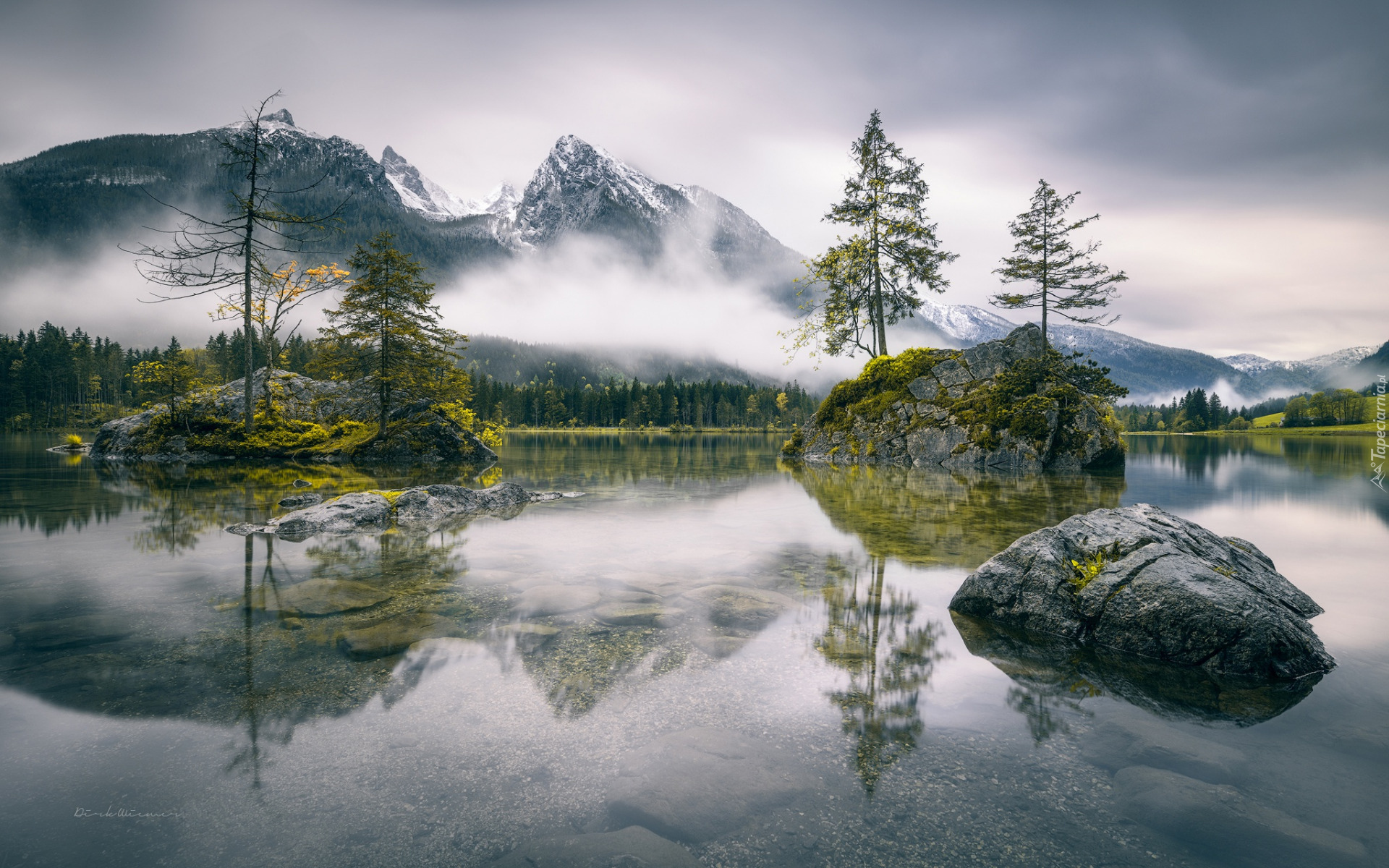 Edytor tapety: Drzewa na skałach w bawarskim jeziorze Hintersee