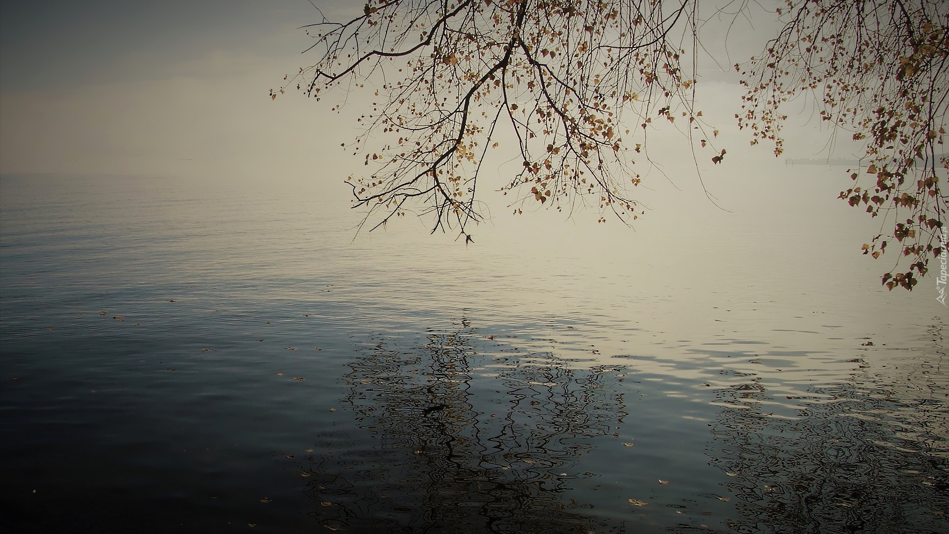 Edytor tapety: Gałęzie jesiennego drzewa nad zamglonym jeziorem
