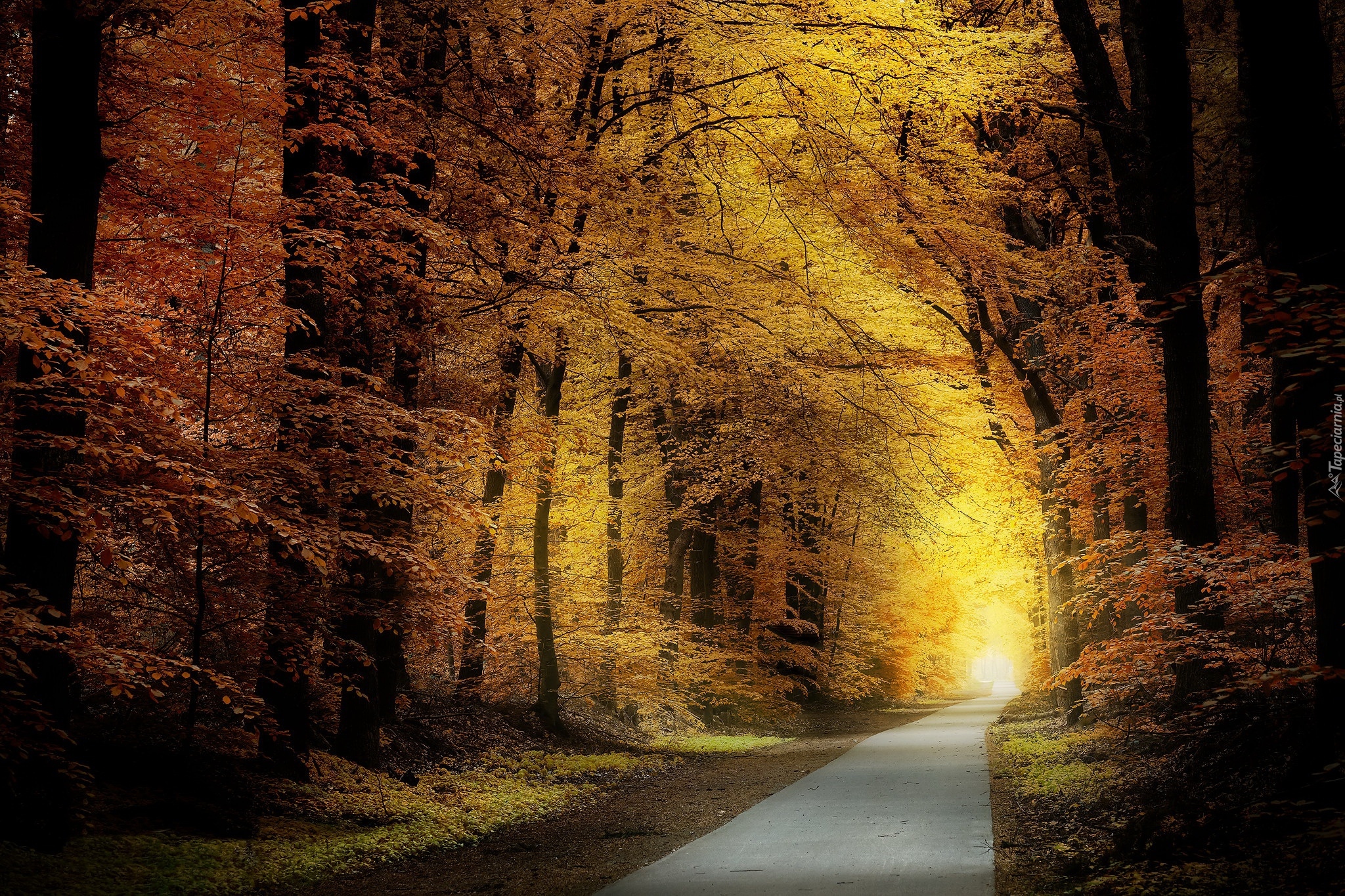 Edytor tapety: Oświetlona słońcem droga w jesiennym liściastym lesie
