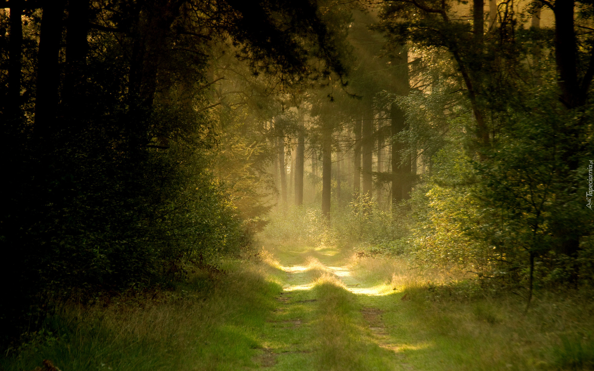 Edytor tapety: Światło słoneczne na ścieżce w zamglonym lesie