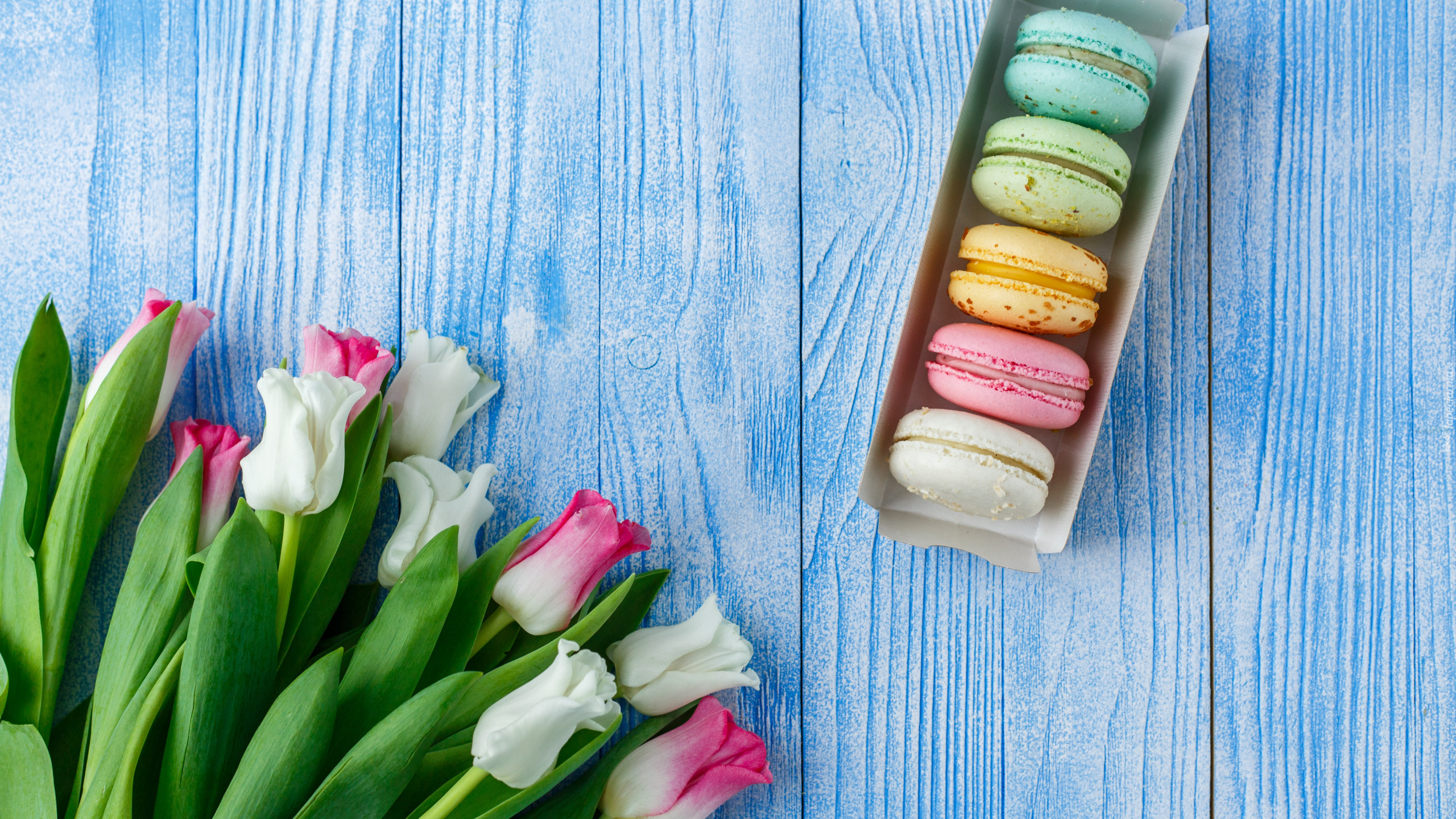 Edytor tapety: Kolorowe tulipany obok makaroników