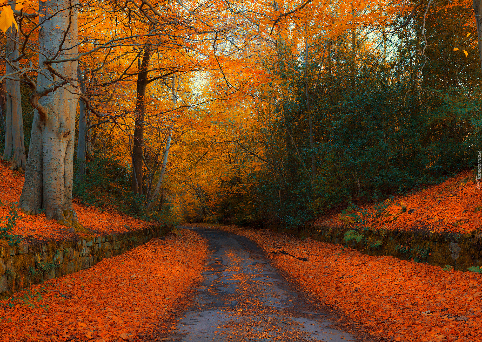 Edytor tapety: Droga w lesie usłana pomarańczowymi liśćmi