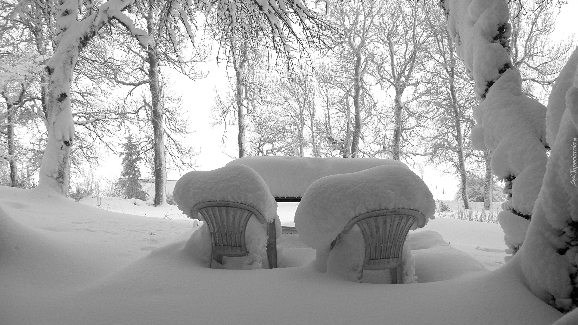 Edytor tapety: Zasypane śniegiem krzesła ogrodowe