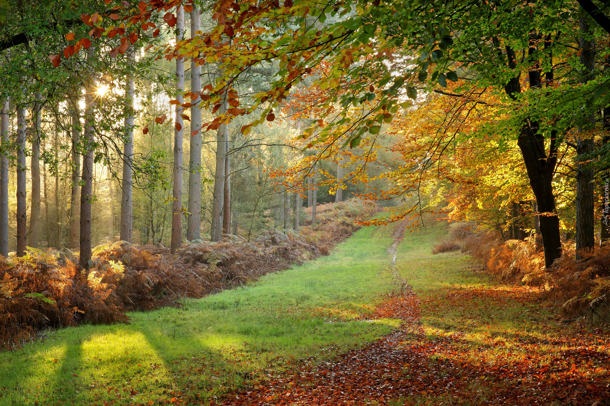 Edytor tapety: Zrudziałe paprocie pod jesiennymi drzewami w lesie