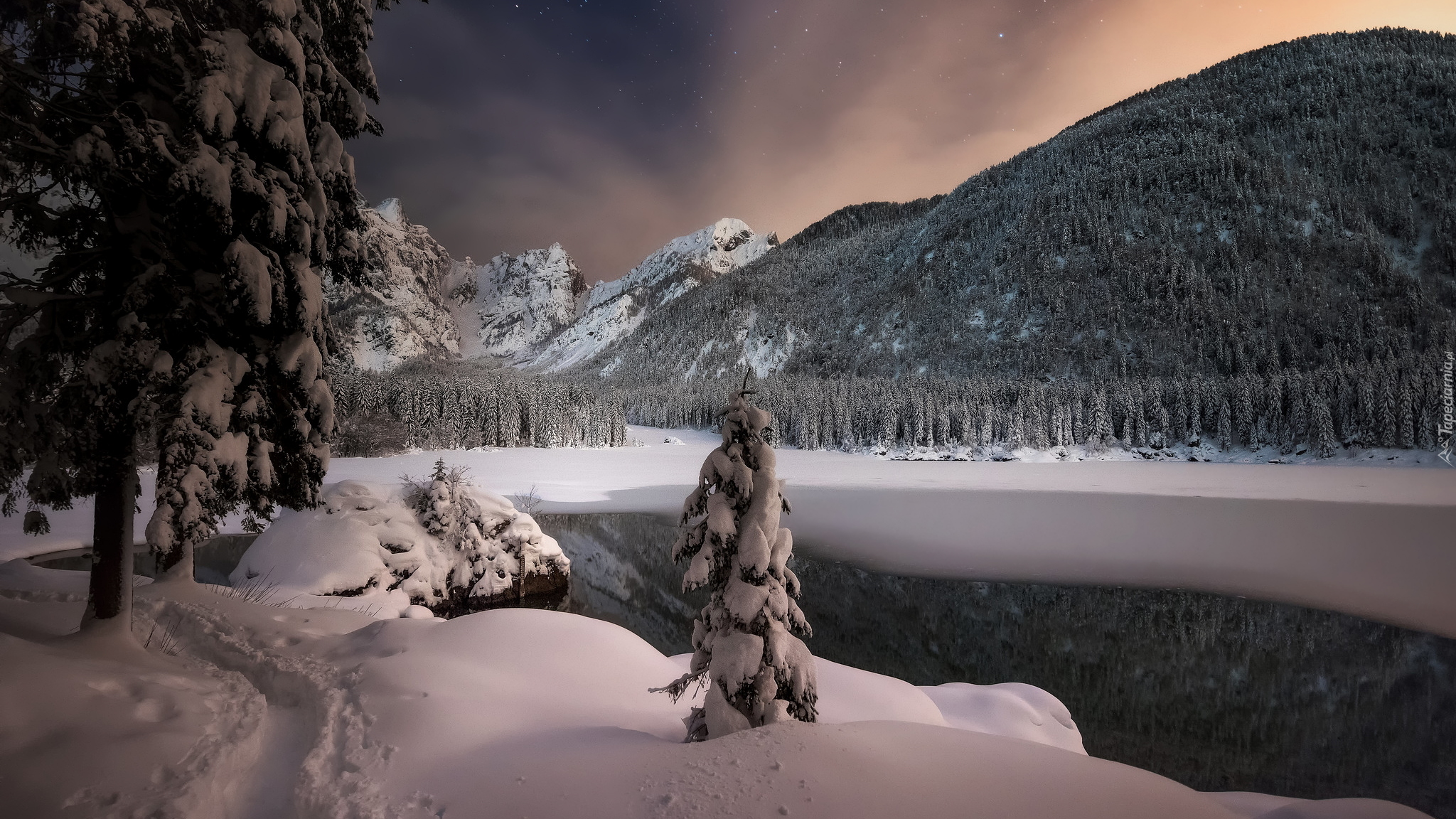 Edytor tapety: Zimowy krajobraz nad jeziorem Fusine Lake we Włoszech