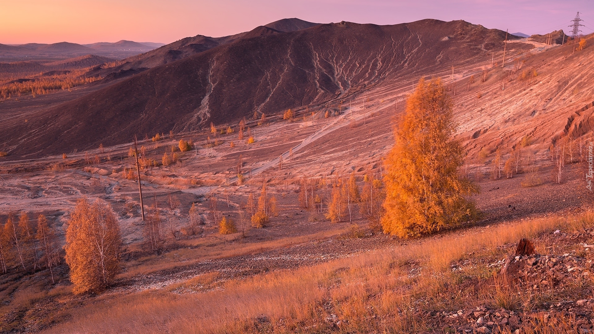 Edytor tapety: Pożółkłe drzewa na tle wzgórz