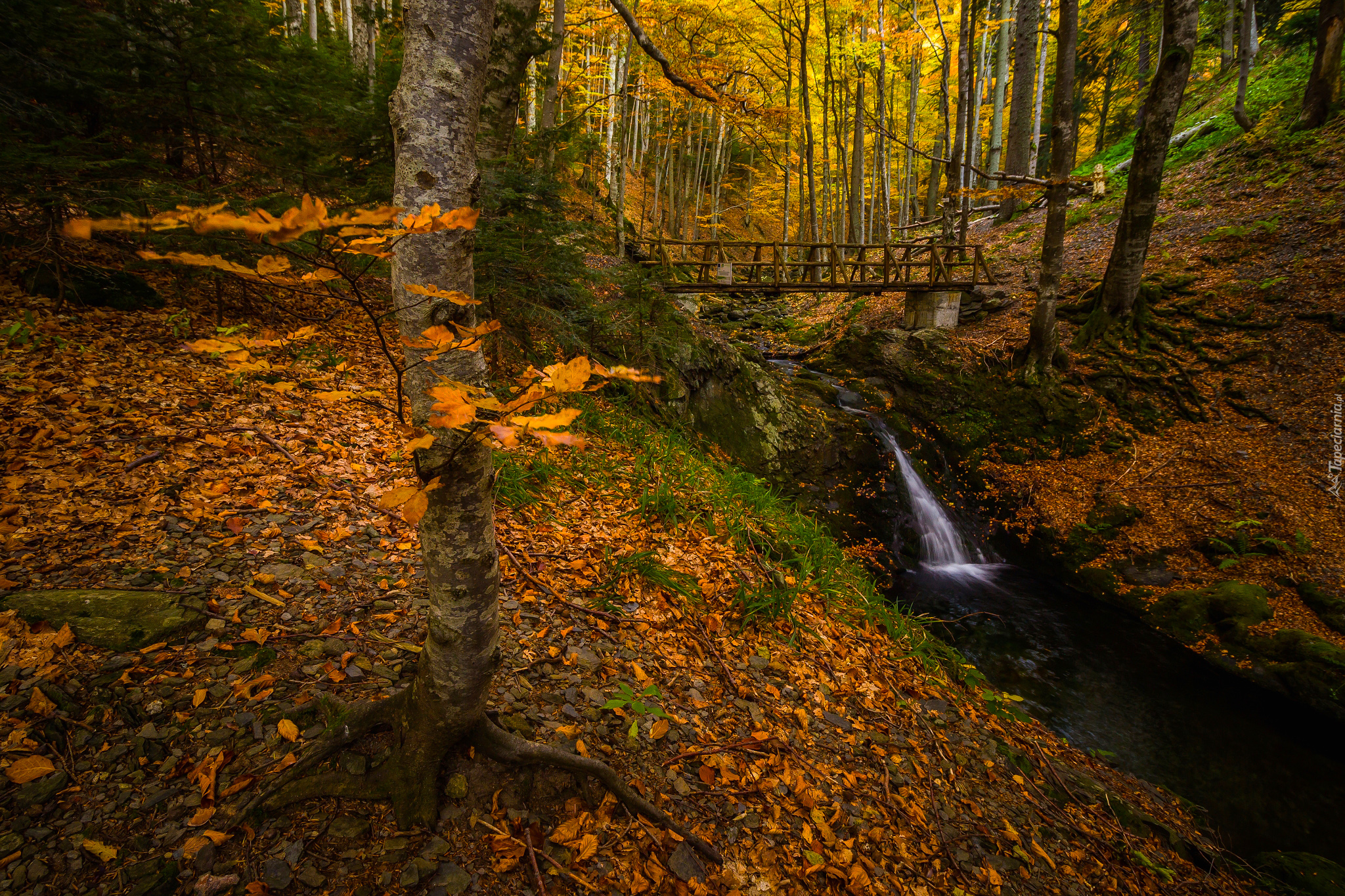 Edytor tapety: Drewniany mostek nad leśną rzeką