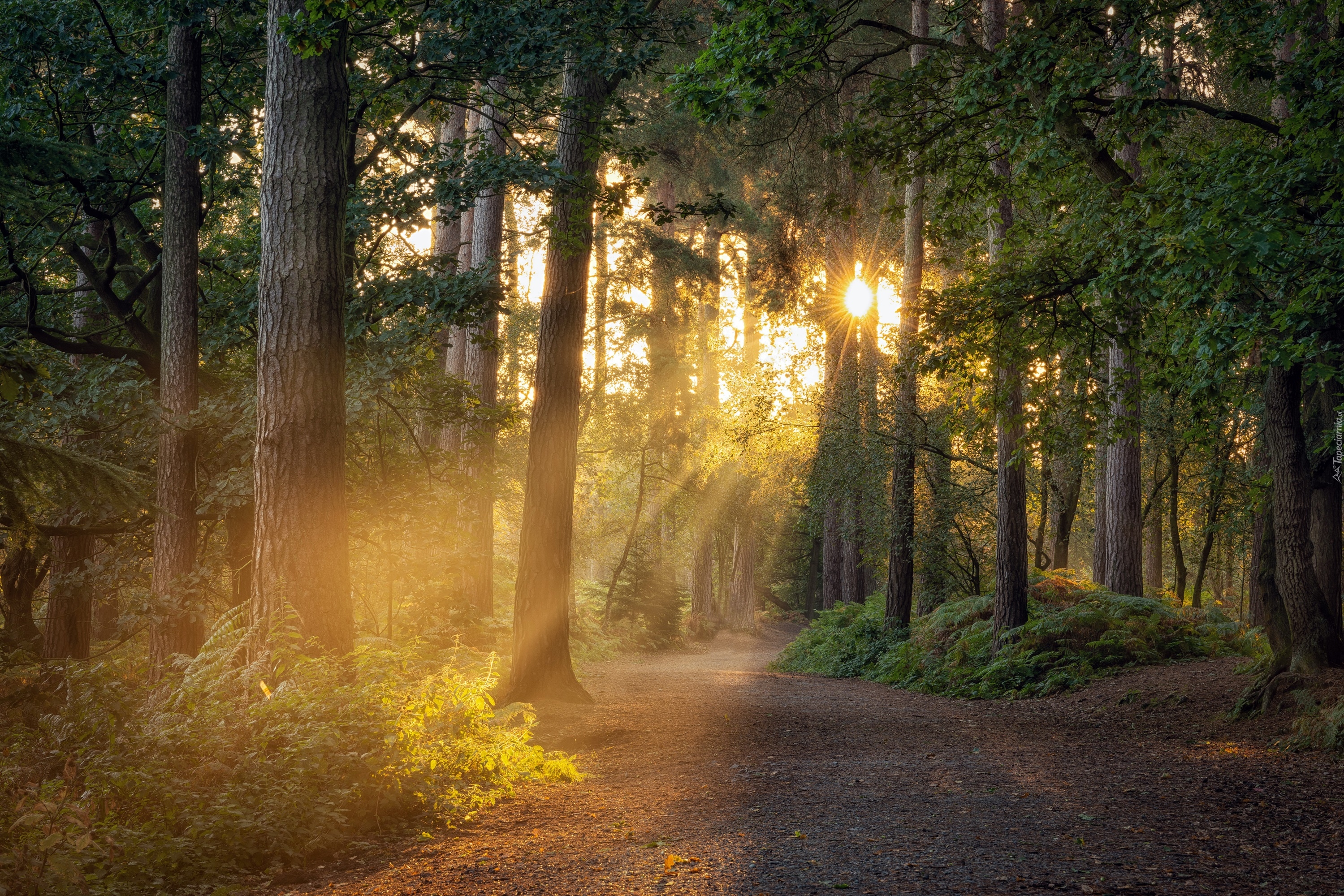 Edytor tapety: Promienie słoneczne wśród drzew w zamglonym lesie