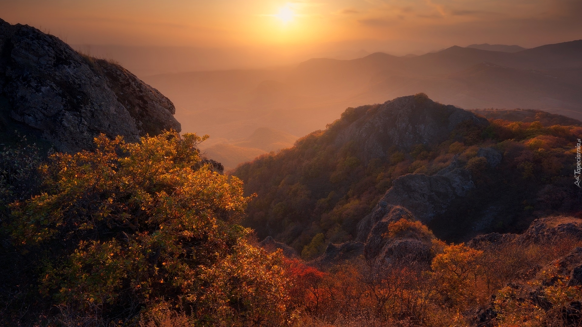 Edytor tapety: Zamglone słońce nad górami