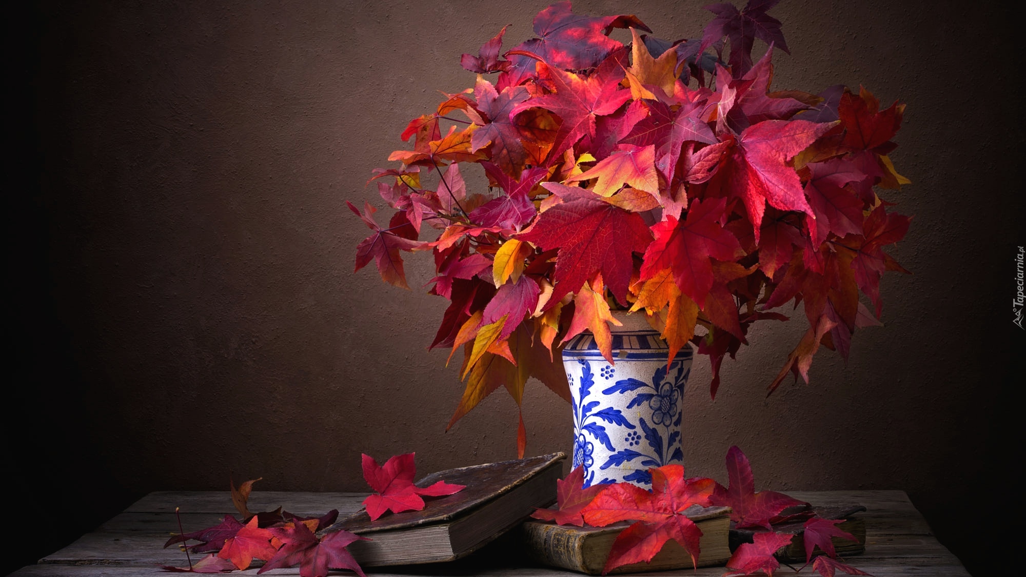 Edytor tapety: Bukiet kolorowych liści klonu obok książek