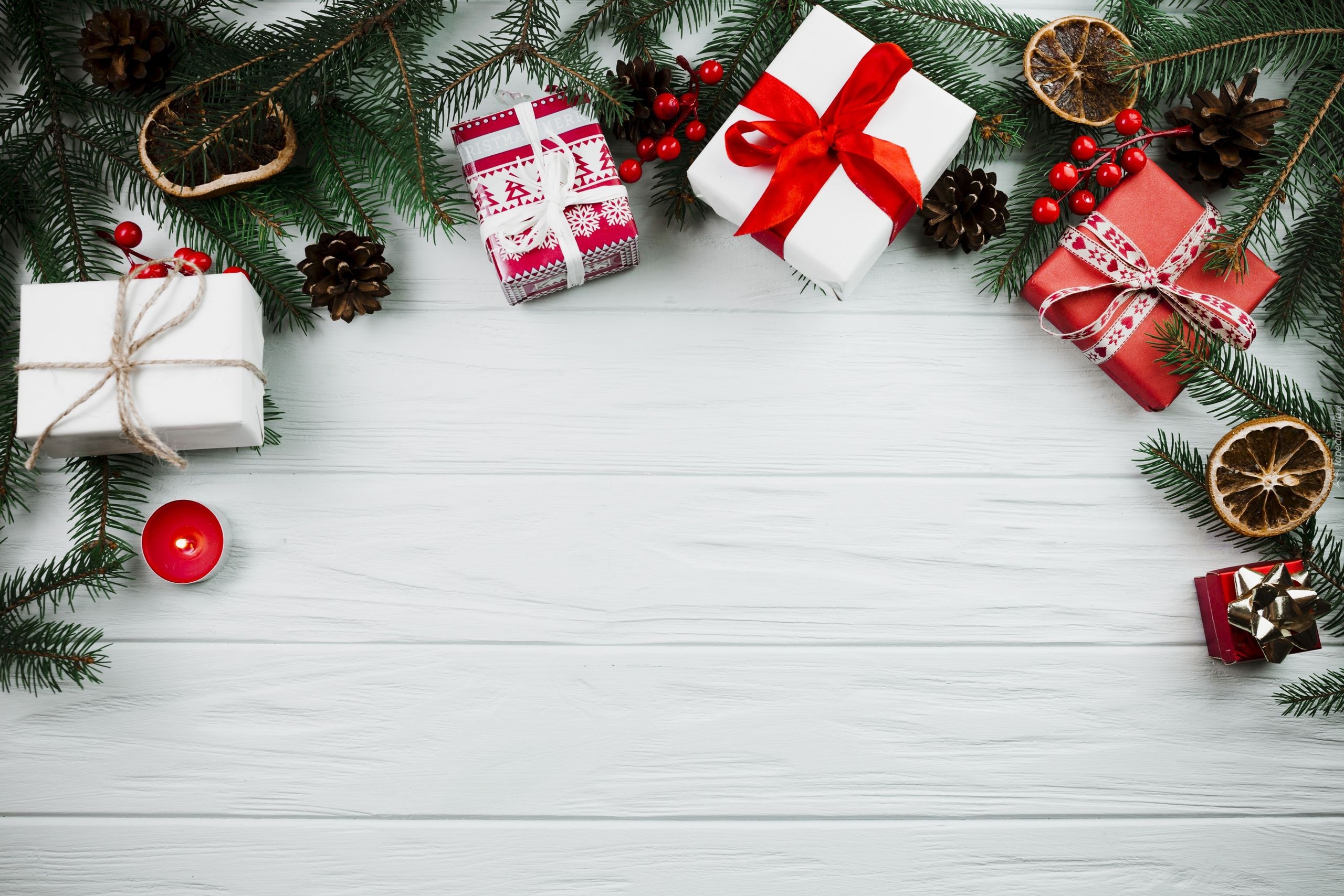 Edytor tapety: Prezenty i szyszki na gałązkach choinki