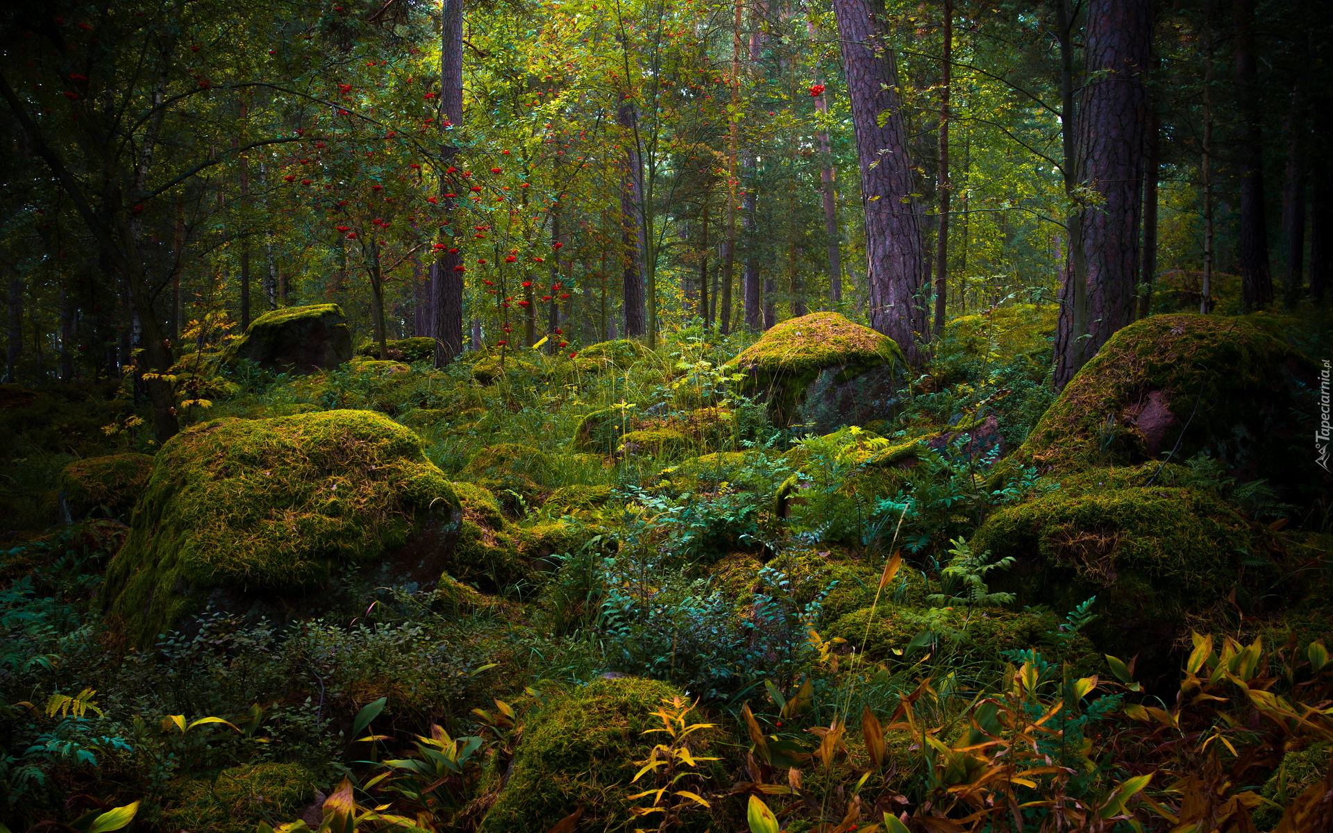 Edytor tapety: Omszałe kamienie w zielonym lesie