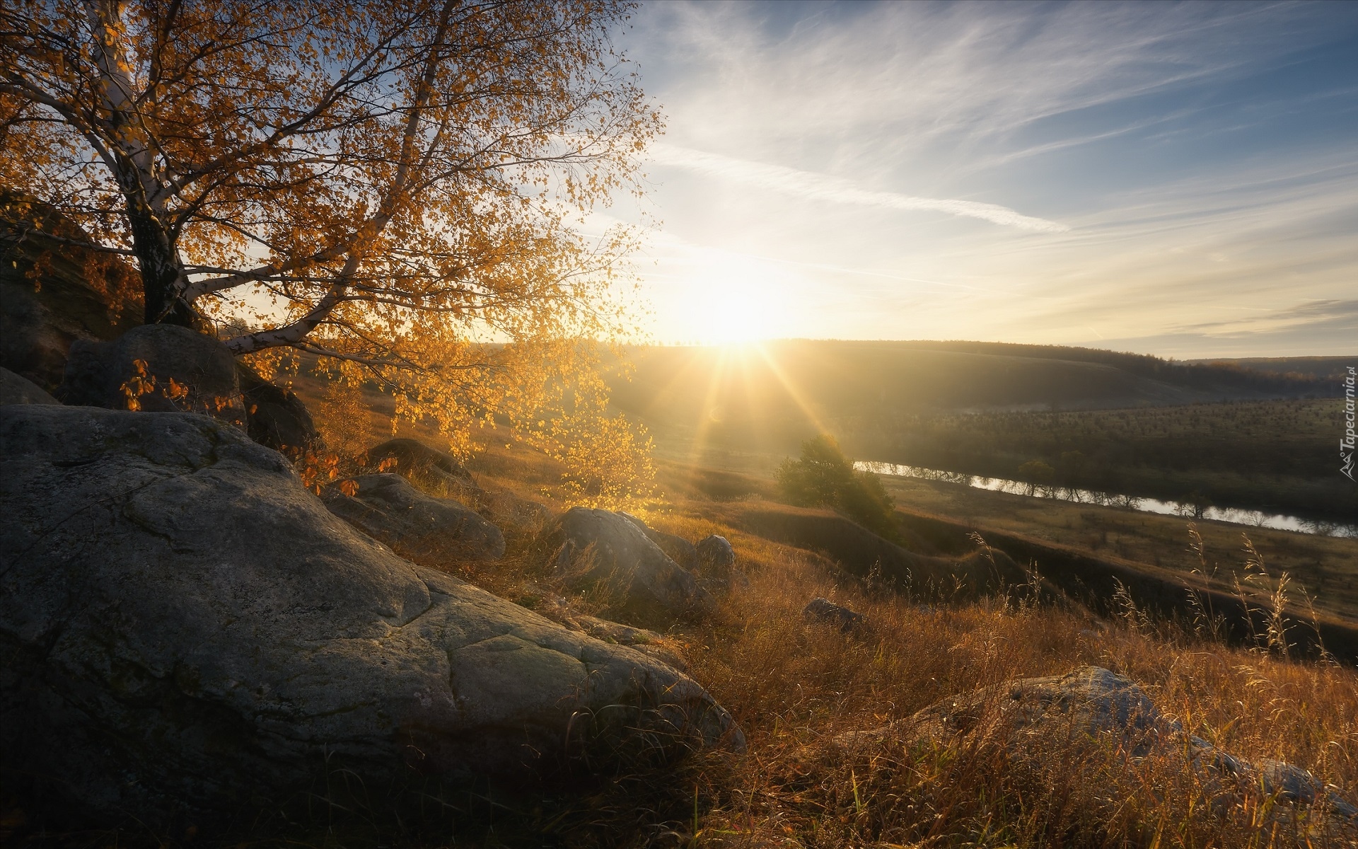 Edytor tapety: Brzoza wśród skał w promieniach słońca
