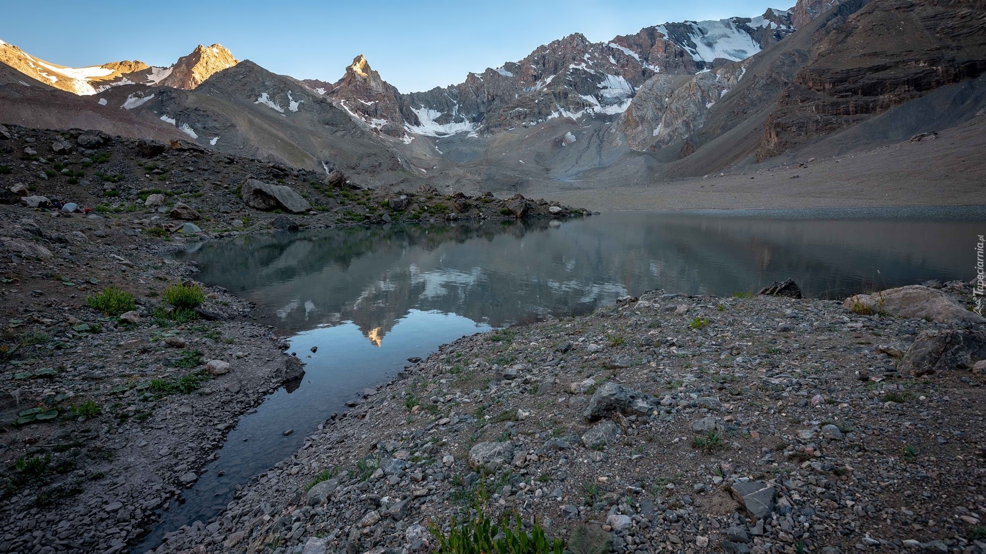 Edytor tapety: Kamienie przy brzegu górskiego jeziora