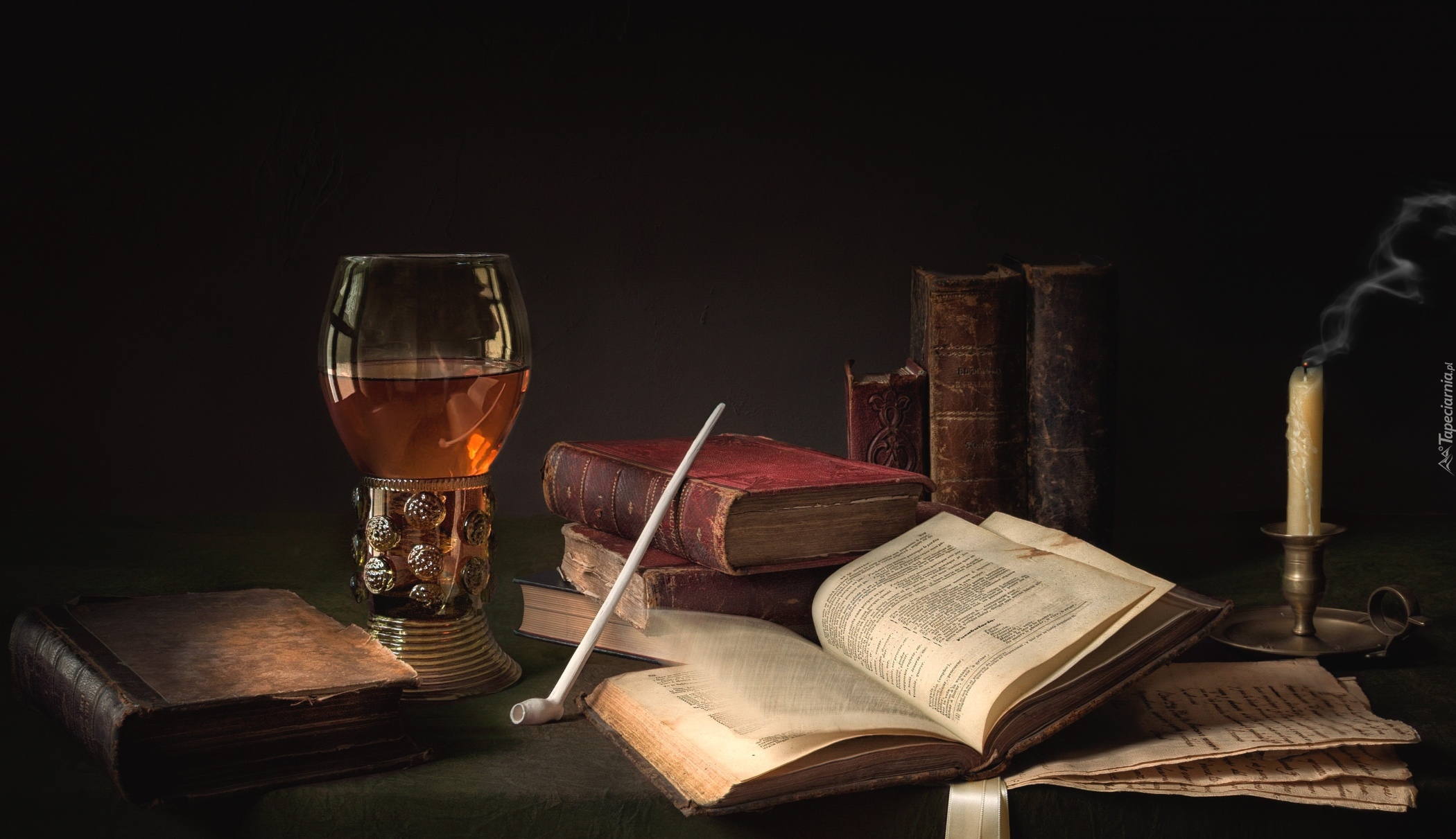 Edytor tapety: Kielich wina obok starych ksiąg i świecy