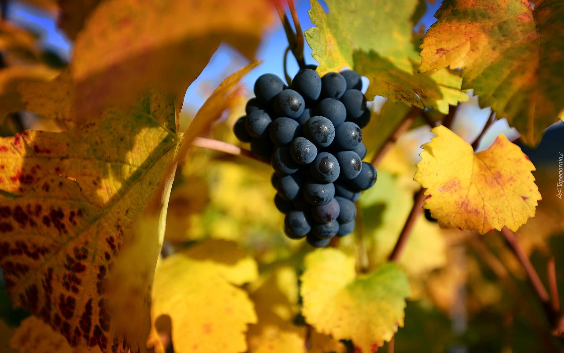 Edytor tapety: Kiść ciemnych winogron wśród liści