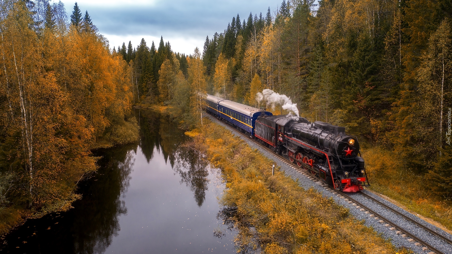 Edytor tapety: Pociąg obok leśnej rzeki