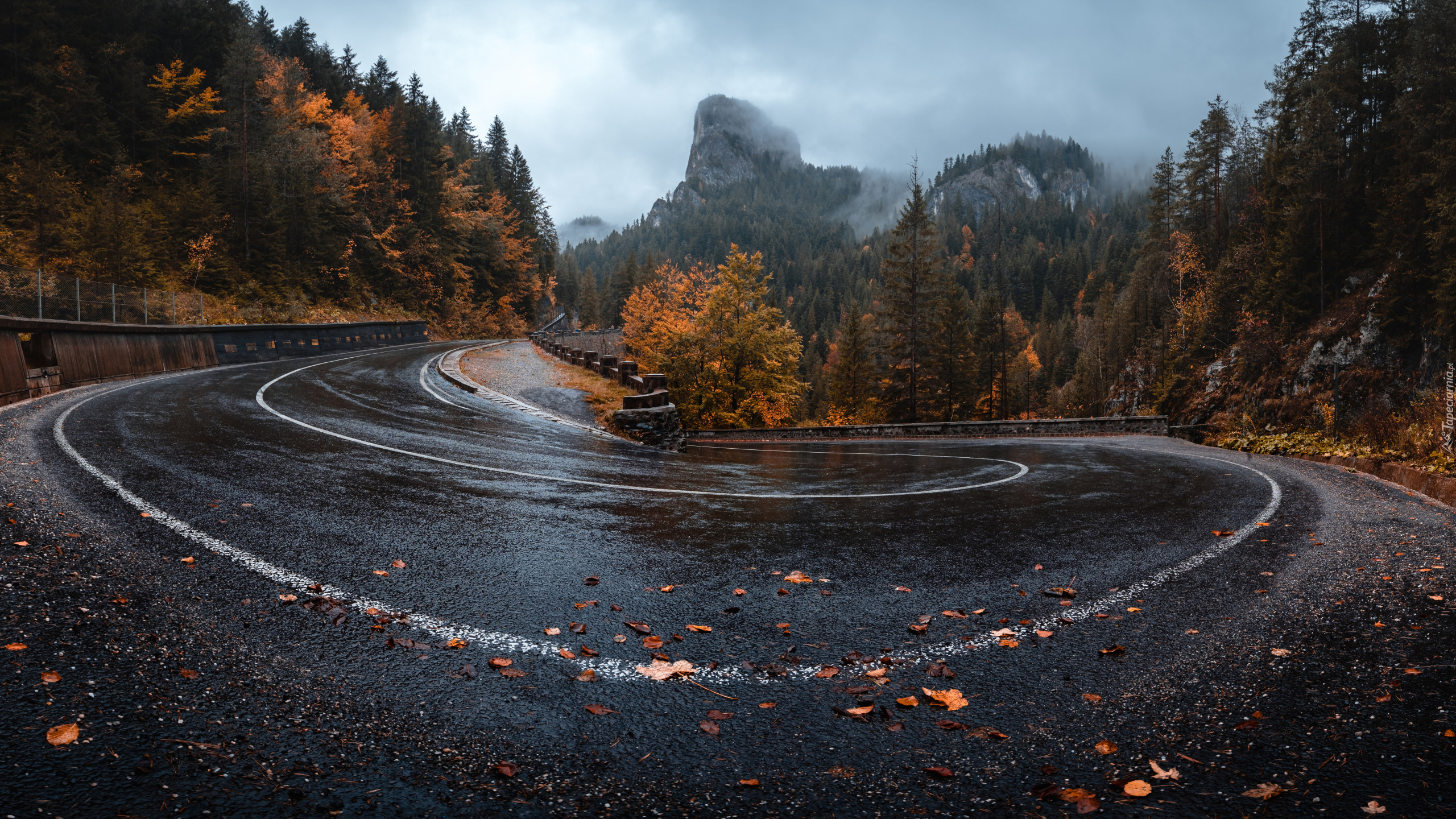 Edytor tapety: Zakręt asfaltowej mokrej drogi w górach