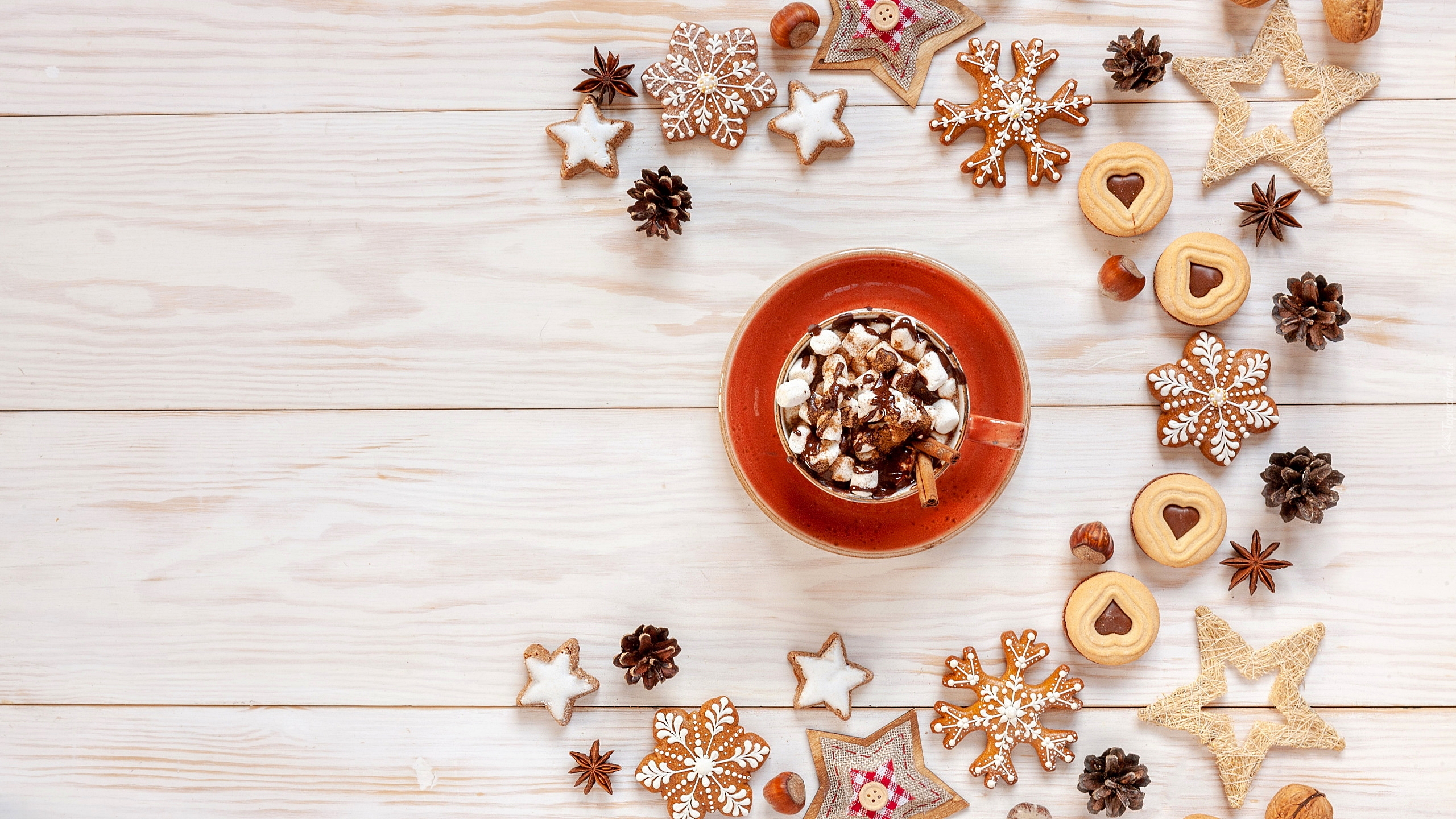 Edytor tapety: Świąteczne ciasteczka obok gorącej czekolady w kubku