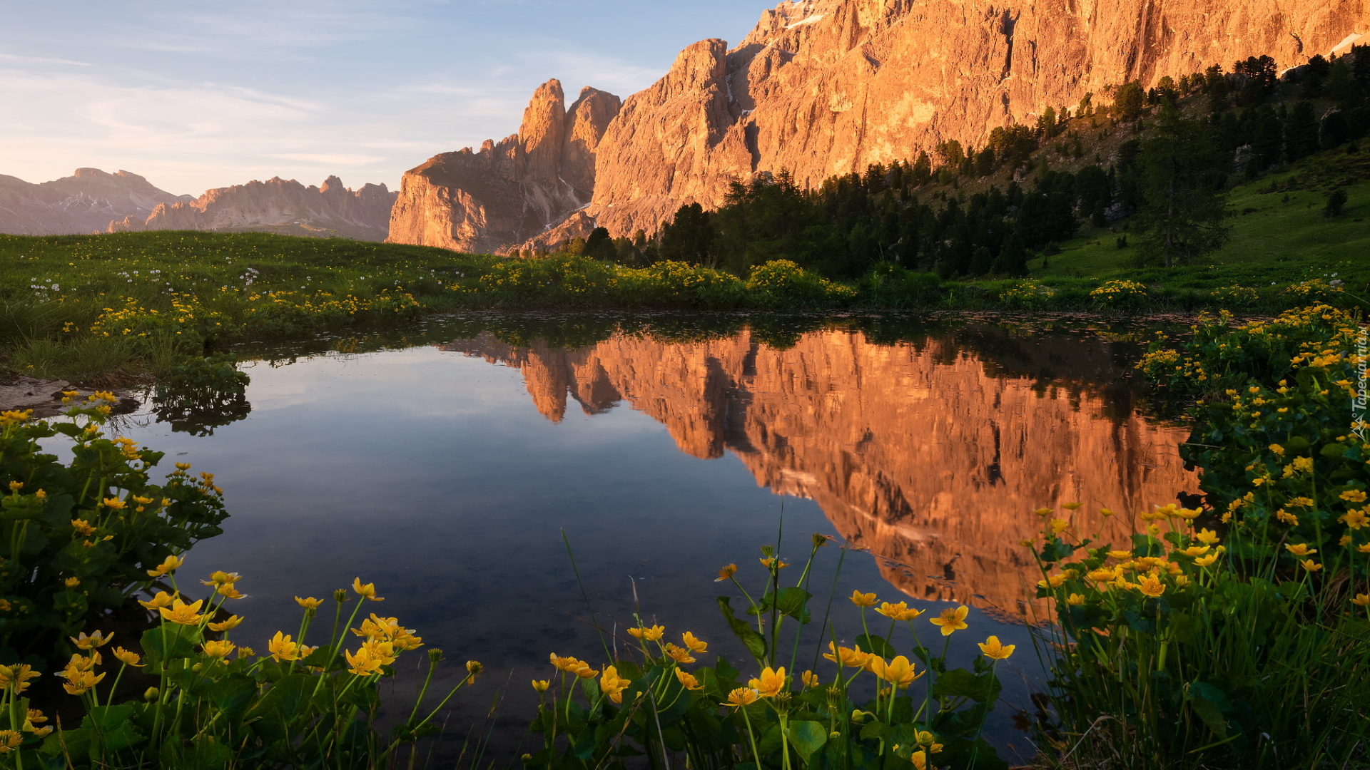 Edytor tapety: Żółte kwiaty wokół górskiego stawu