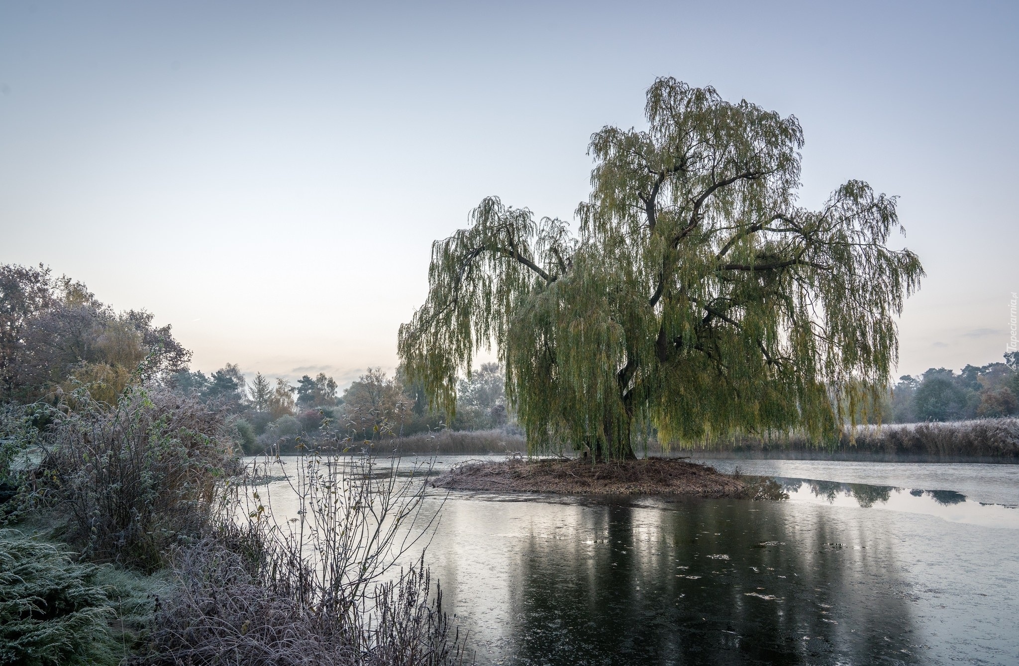 Edytor tapety: Wierzba płacząca na wysepce pośród jeziora