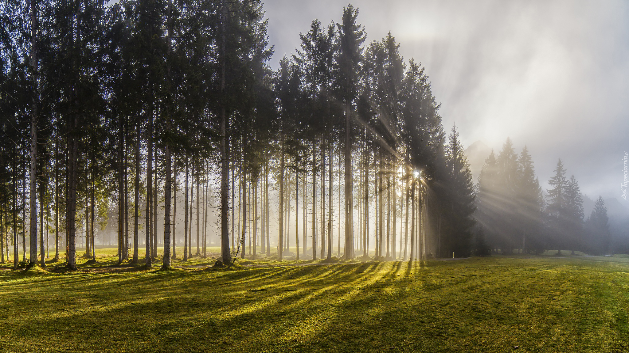 Edytor tapety: Drzewa we mgle rozświetlone słońcem