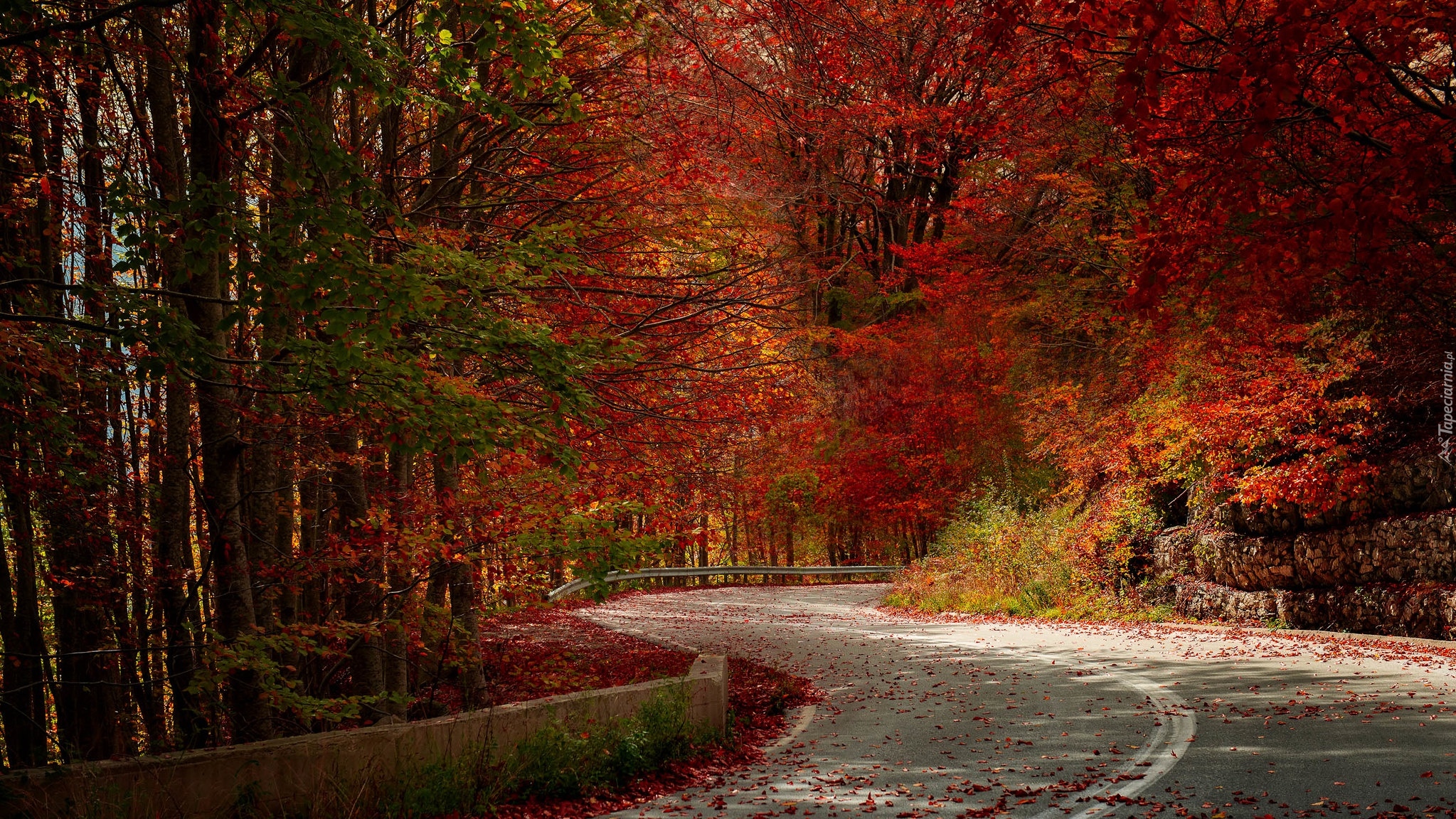 Edytor tapety: Drzewa z czerwonymi liśćmi przy drodze
