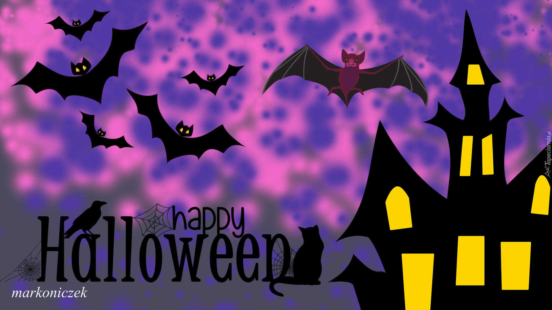 Edytor tapety: Upiorny zamek z nietoperzami i napisem Happy Halloween