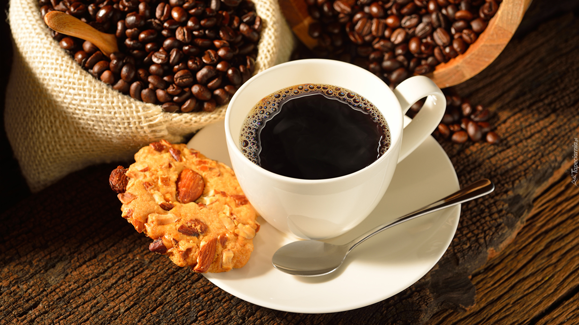 Edytor tapety: Filiżanka kawy z ciasteczkiem na spodku