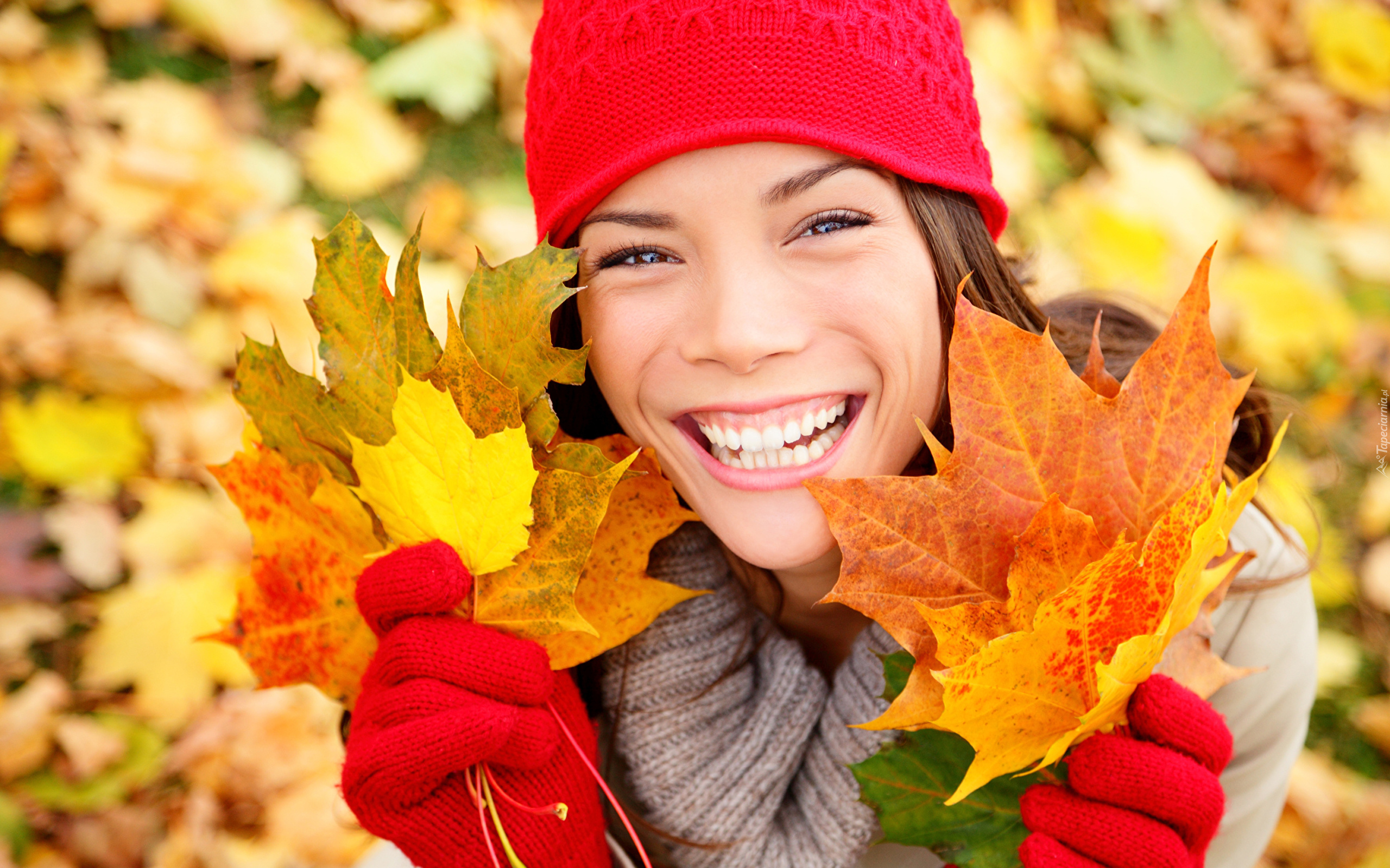 Edytor tapety: Uśmiechnięta dziewczyna z liśćmi klonu w ręce