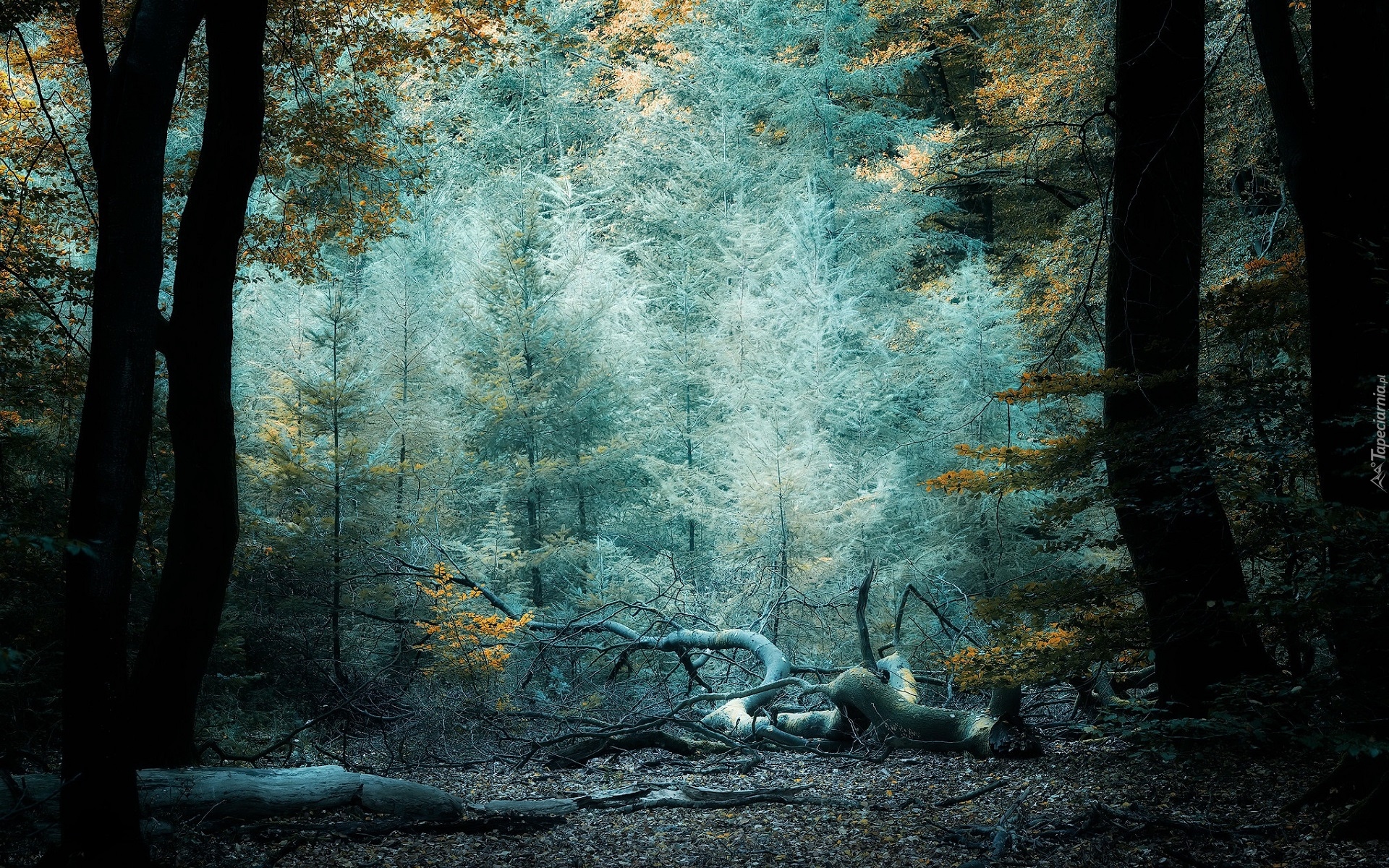 Edytor tapety: Uschnięty konar pod drzewami w lesie