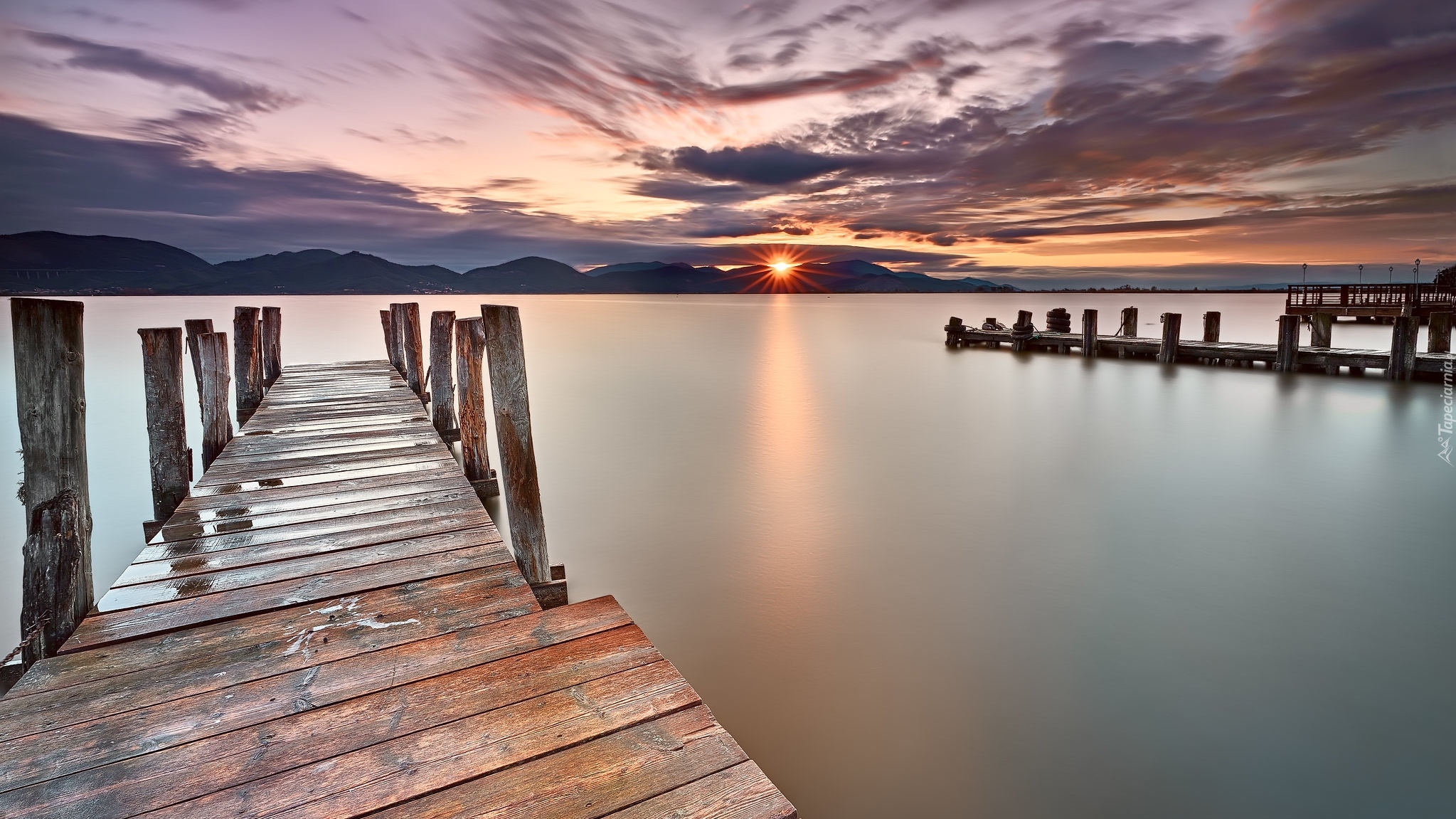 Edytor tapety: Pomosty na morzu w zachodzącym słońcu