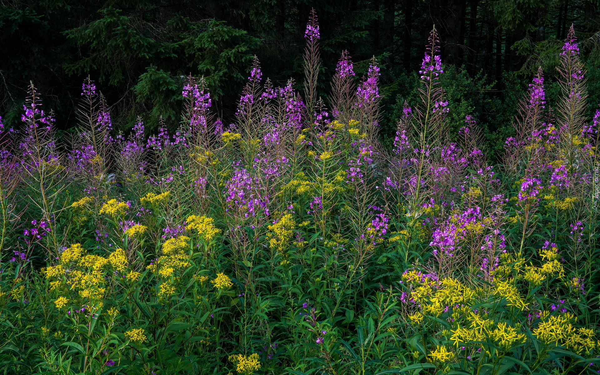 Edytor tapety: Żółte i fioletowe kwiaty pod lasem