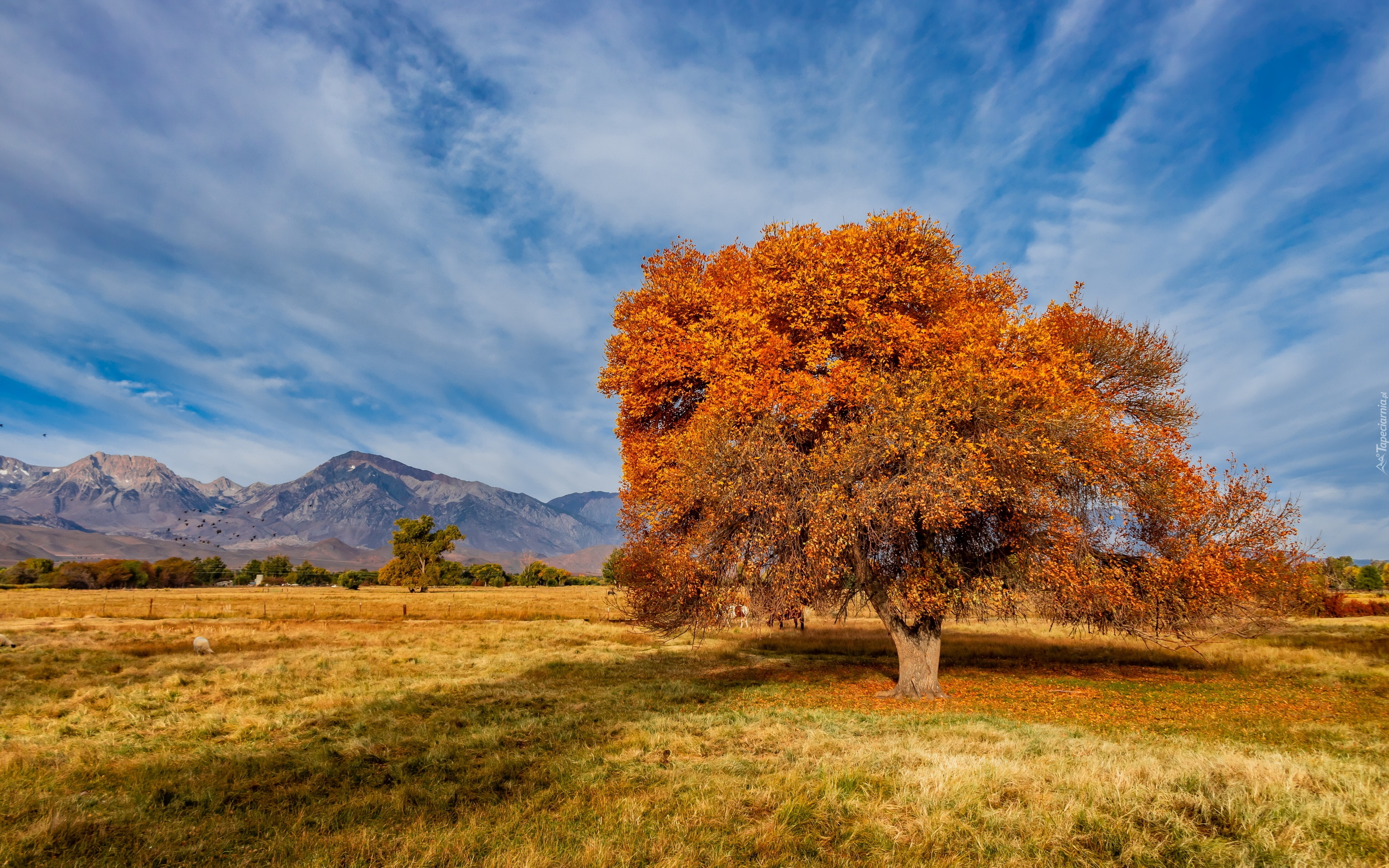 Edytor tapety: Rozłożyste drzewo na górskiej łące