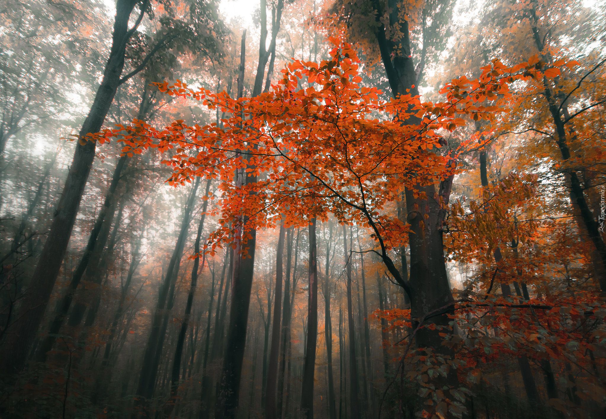 Edytor tapety: Kolorowe drzewo w zamglonym lesie