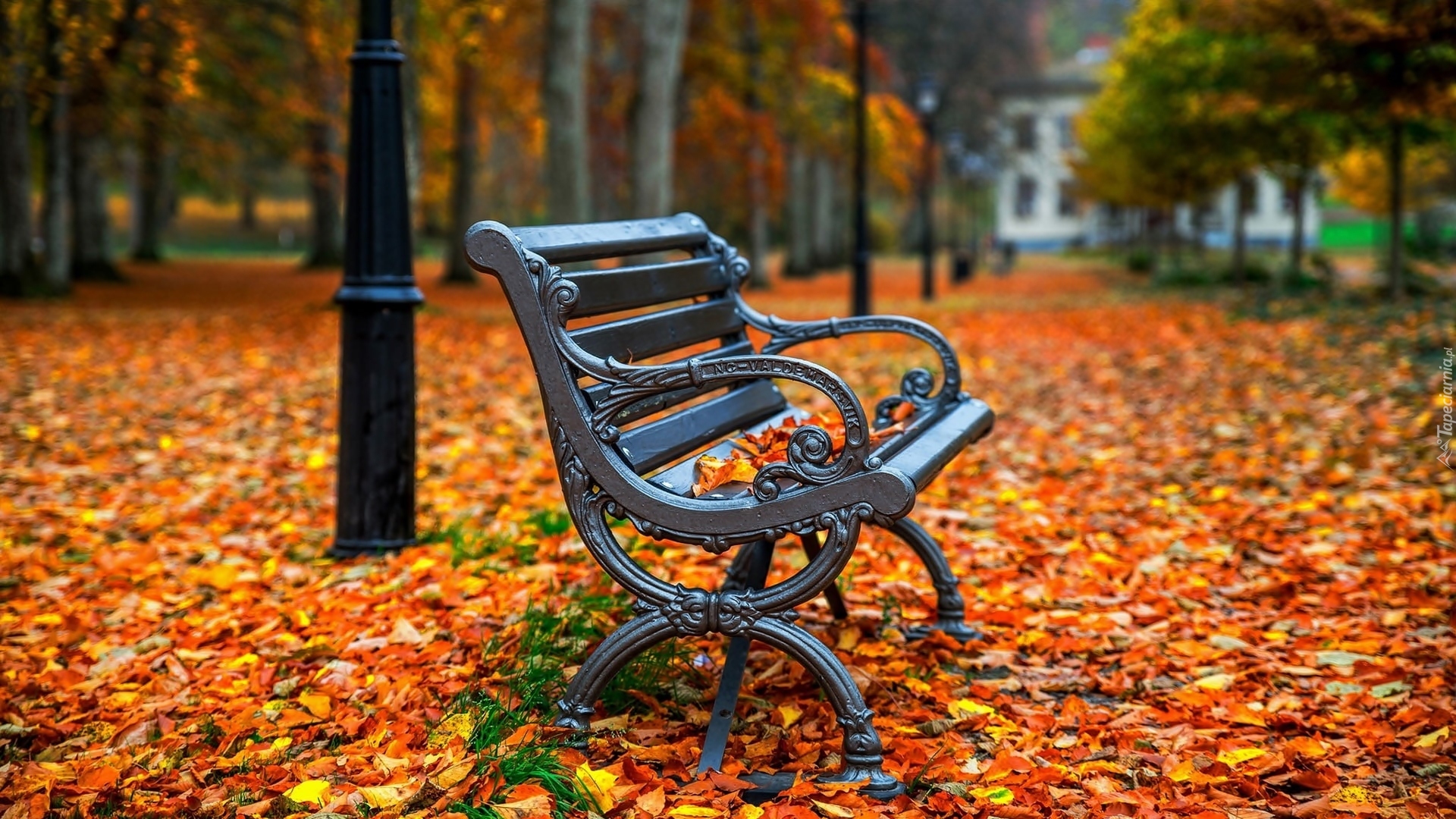 Edytor tapety: Metalowa ławka w parku jesienią