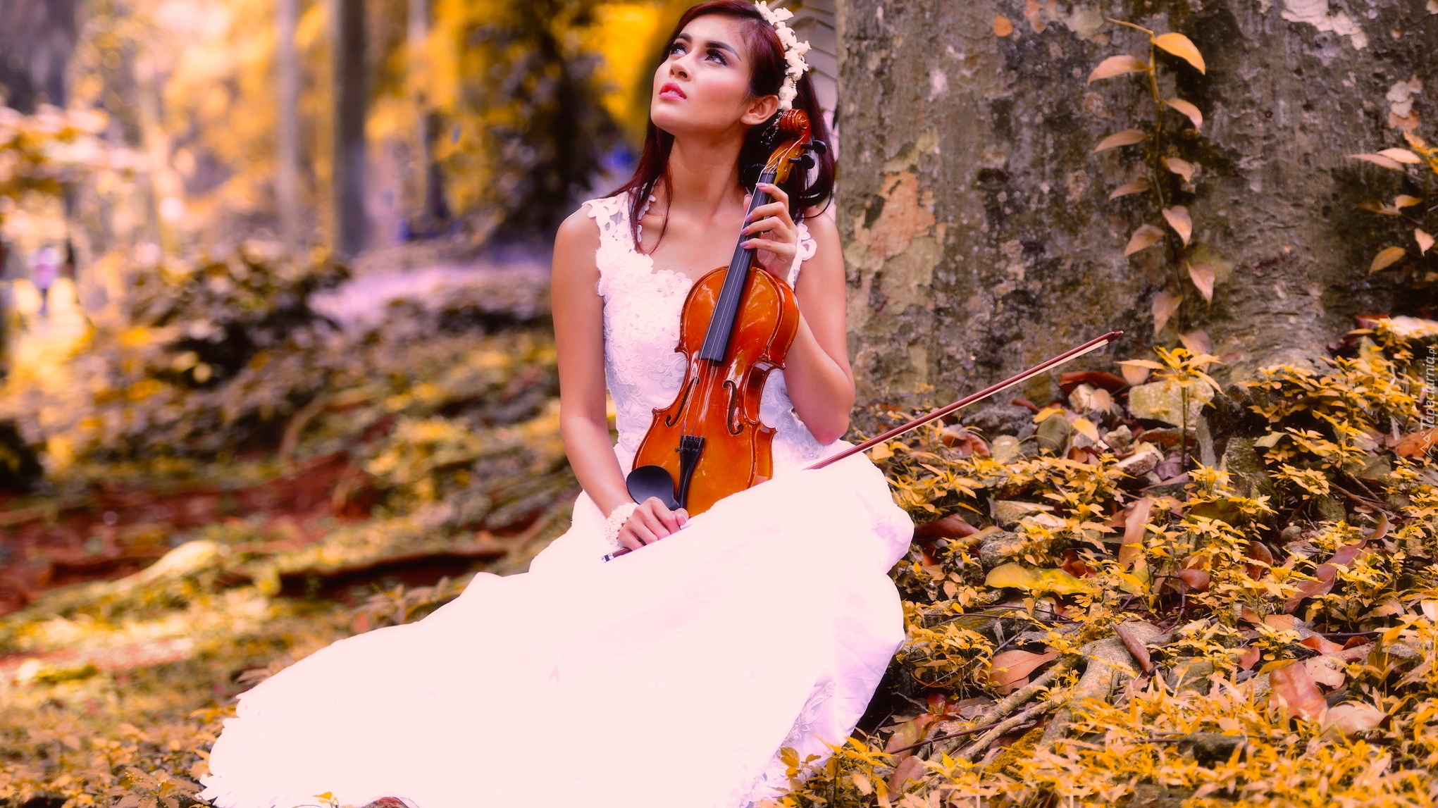 Edytor tapety: Dziewczyna w białej sukni ze skrzypcami
