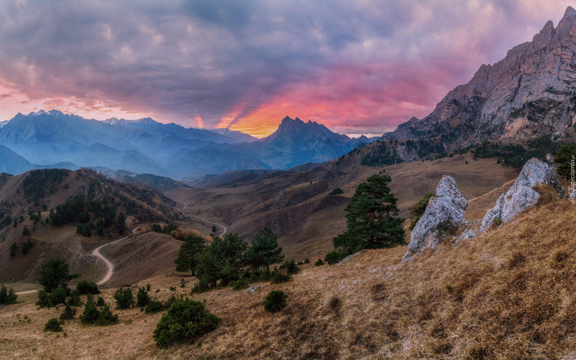 Edytor tapety: Górski krajobraz o wschodzie słońca