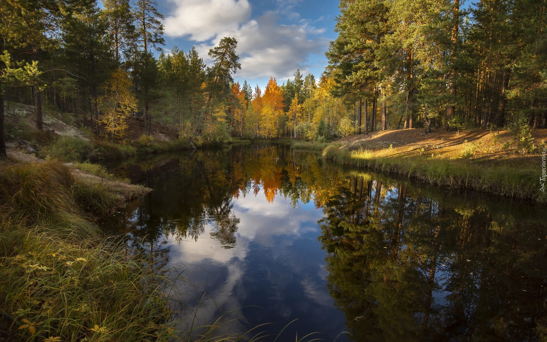 Edytor tapety: Oświetlony słońcem jesienny las nad rzeką
