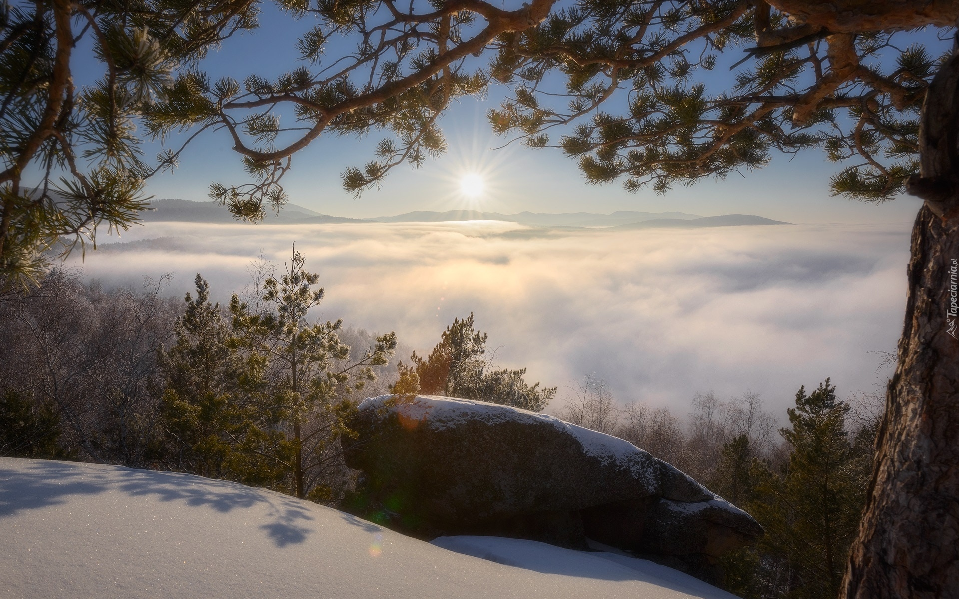 Edytor tapety: Widok ze wzgórza na zamglony Ałtaj