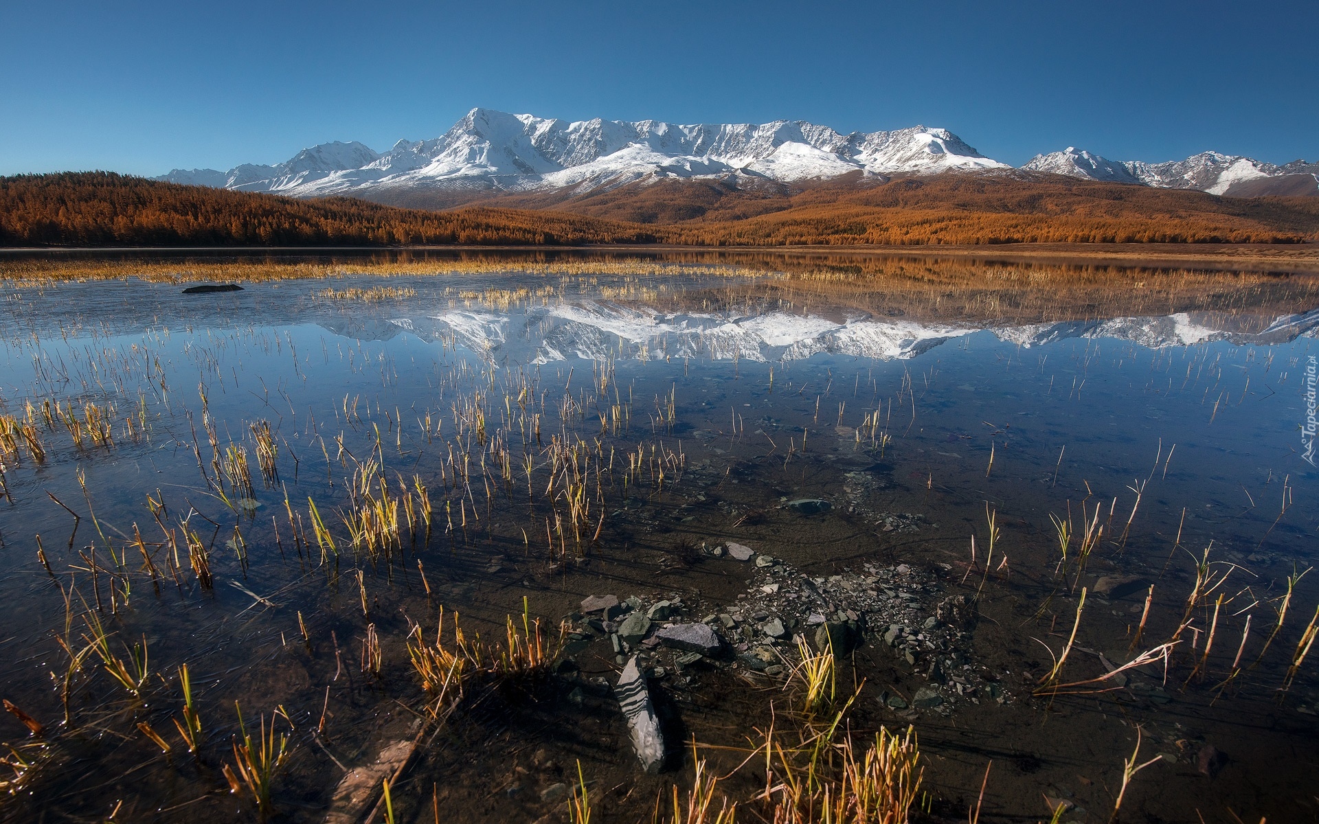 Edytor tapety: Jezioro z widokiem na ośnieżone szczyty gór