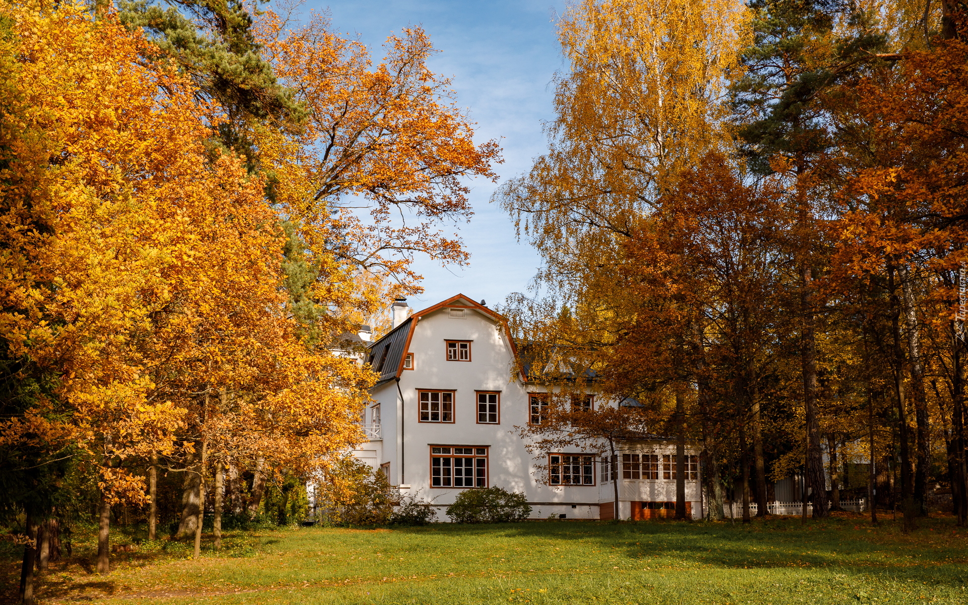 Edytor tapety: Biały dom wśród jesiennych drzew