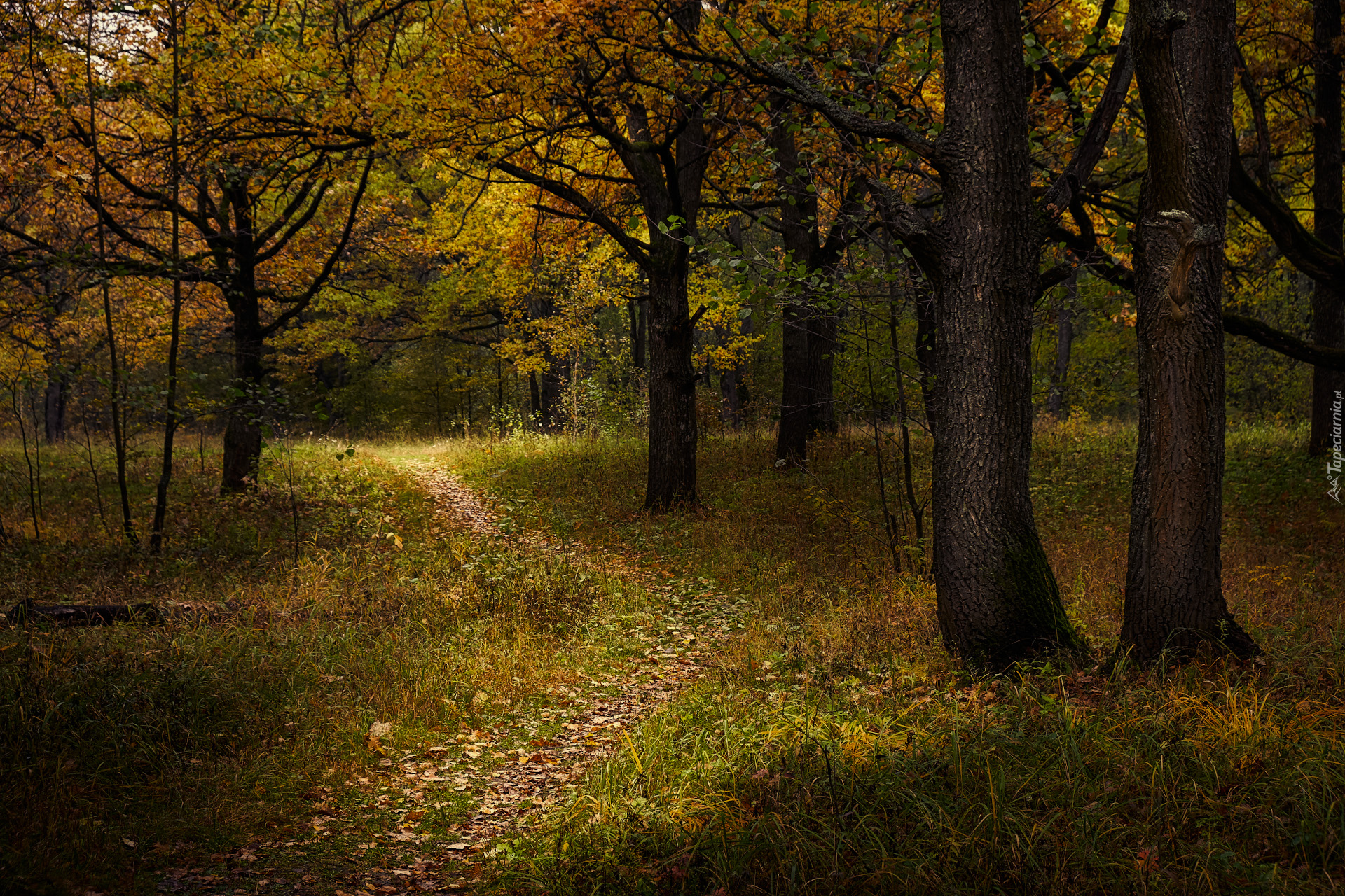 Edytor tapety: Ścieżka pomiędzy drzewami w jesiennym lesie