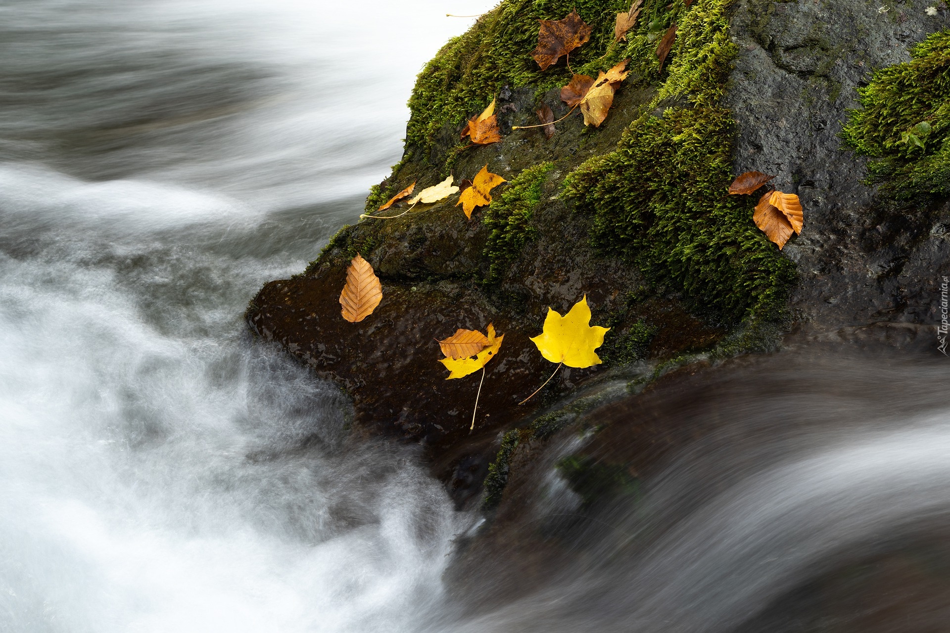 Edytor tapety: Liście na omszałej skale w rwącej rzece