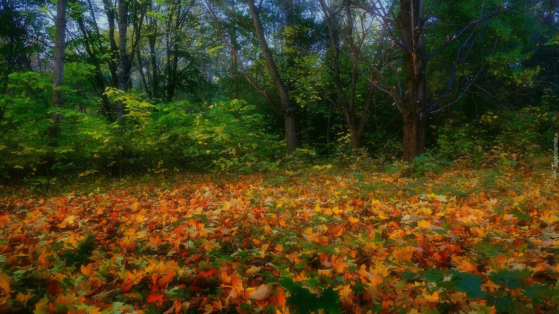 Edytor tapety: Opadłe liście na trawie obok lasu