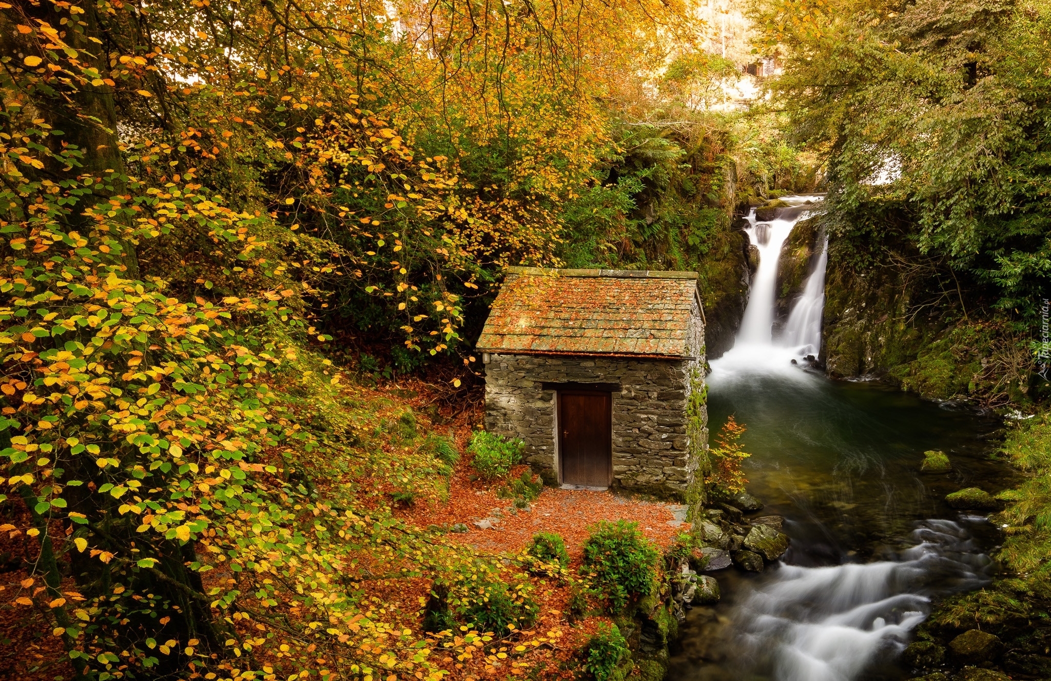 Edytor tapety: Dom widokowy na wodospad w angielskiej wsi Rydal