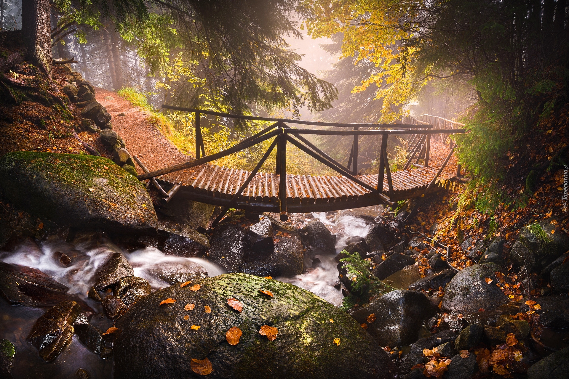 Edytor tapety: Drewniany most nad kamienistą rzeką w zamglonym lesie