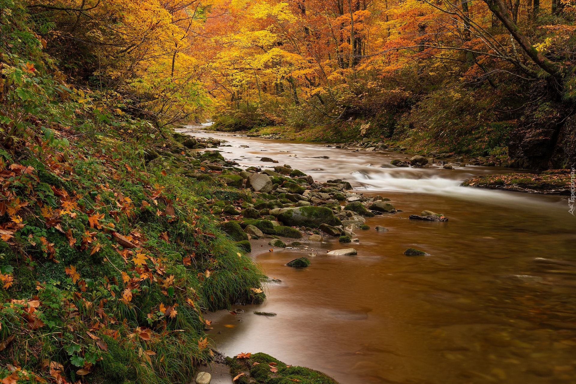 Edytor tapety: Kamienie na brzegu rzeki w jesiennym lesie