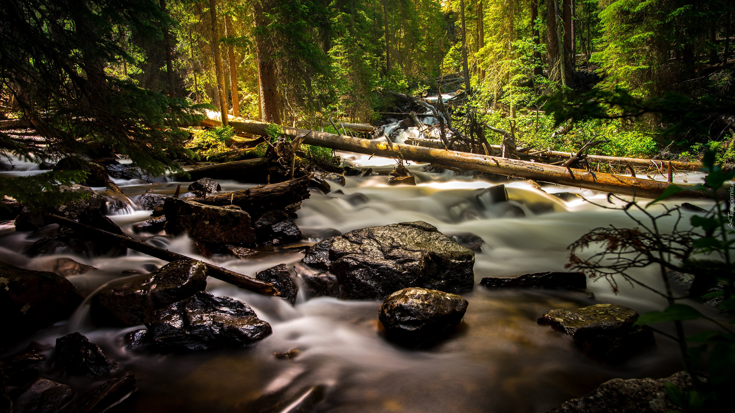 Edytor tapety: Kłody drzewa i kamienie w leśnej rzece